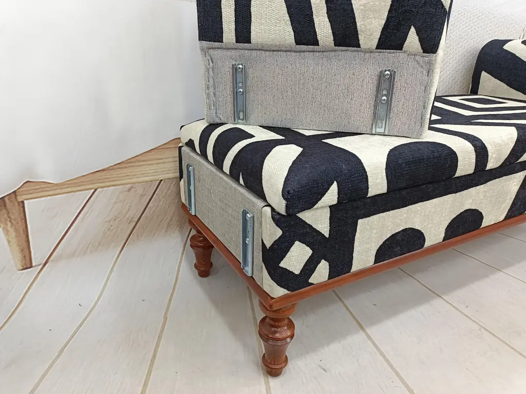 Details SIZE: 18x18x51 Inches ( with legs ) - 45x45x130 cm OVERALL ARM HEIGHT: 24 inches ARM WIDTH: 5 inches STORAGE HEIGHT: 5.5 inches STORAGE WIDTH: 18 inches STORAGE DEPTH: 40 Inches TYPE: Handmade Ottoman Bench CONDITION: is good. CONSTRUCT: It will come with disassemble legs, you can easily put together ottoman top table ( body ) with legs. There is disassembled legs with screw. Set up time around 30 seconds. Please use soft floor to set up. MATERIALS: fabric printed with rug pattern, Hornbeam Body, Textile and zipper backside, poplar wood inside CLEANING: Professionally Cleaned and Disinfected