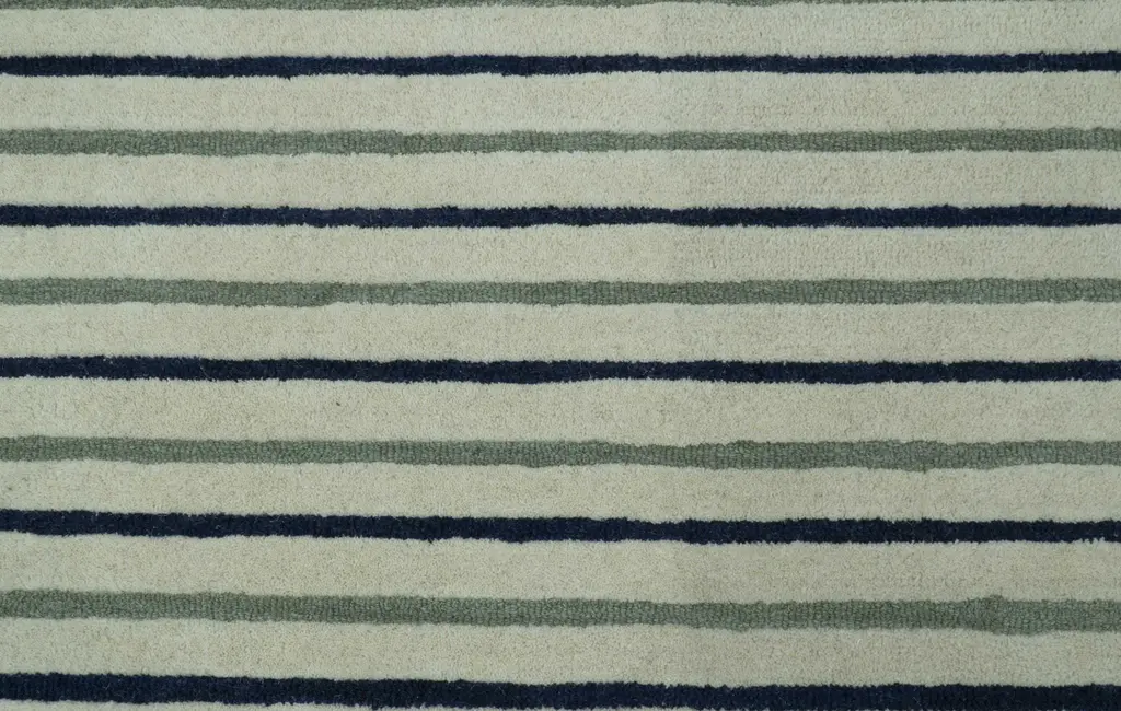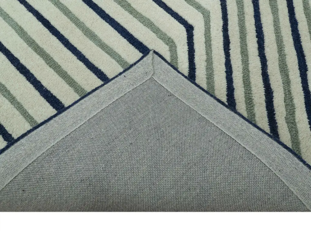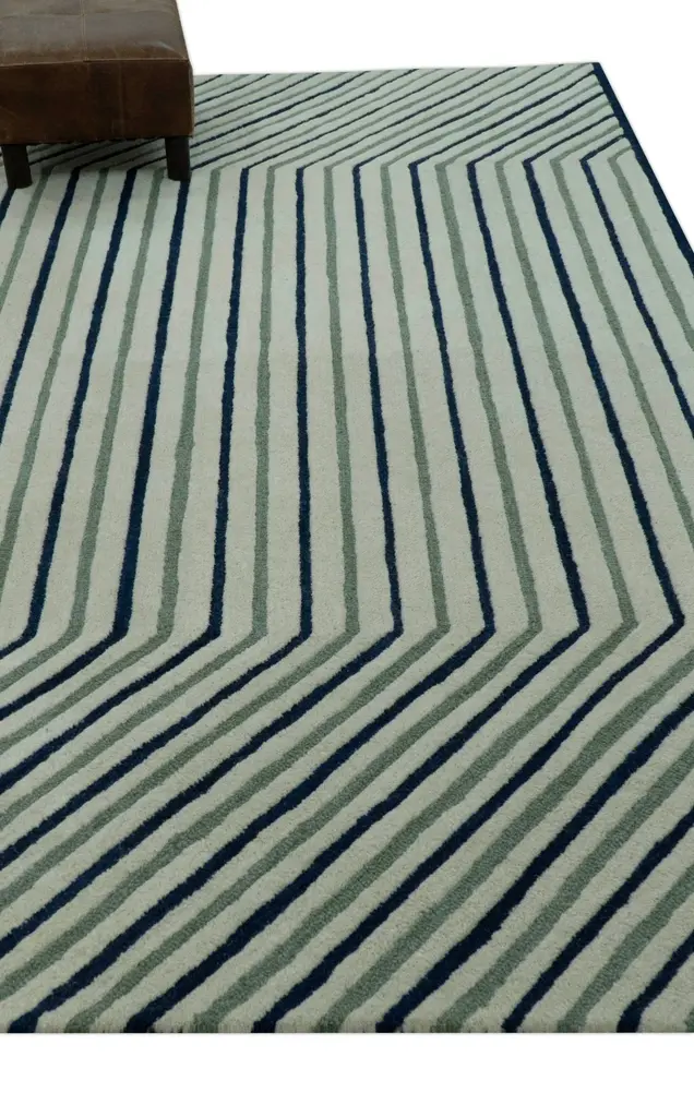 This hand-tufted wool rug features a modern stripes design in calming beige and blue tones. Custom-made with expert craftsmanship, it adds a touch of elegance to any space. High-quality materials ensure durability and long-lasting beauty. Perfect for creating a cozy and stylish atmosphere in your home. Hand-Tufted Made to Order in 25-45 Days Color: Beige, Blue, And Green Perfect Fit for a modern room, kids, living or bedroom USERS GUIDE Avoid prolonged moisture Vacuum regularly and/or shake to remove dust Do not pull any loose threads. Use scissors to simply cut the ends Blot spills immediately with a white cloth. Harsh chemicals may damage or fade the rug Use rug protectors under heavy furniture