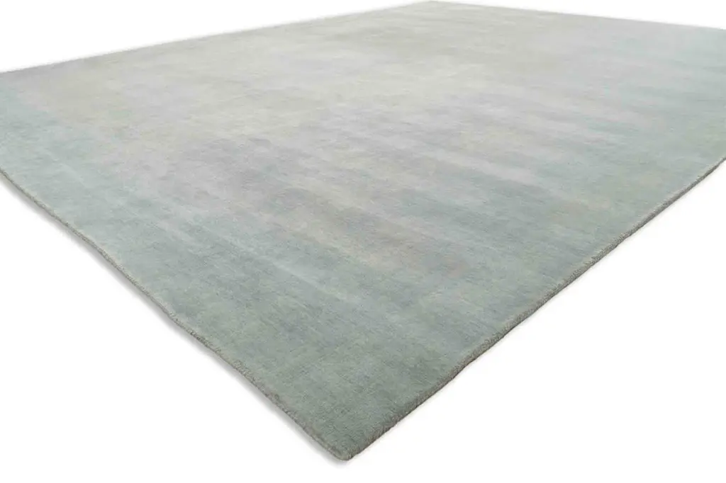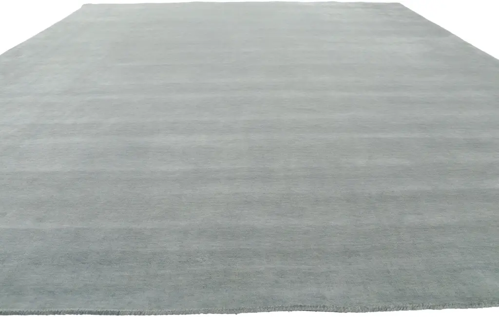 Effortless beauty combined with simplicity and modern style, this handloom wool modern gray rug from India provides a feeling of cozy contentment without the clutter. Imbued with gray tones, the rich waves of abrash of painterly-like brush strokes and softly gradated striations run selvage to selvage blending seamlessly from one to the next. The minimalist composition in combination with its restrained color based around shades of gray gives the piece a refined and most elegant sensibility.