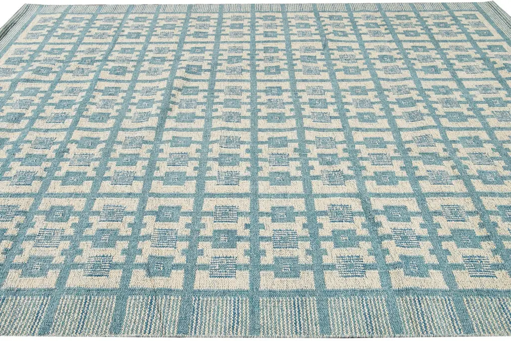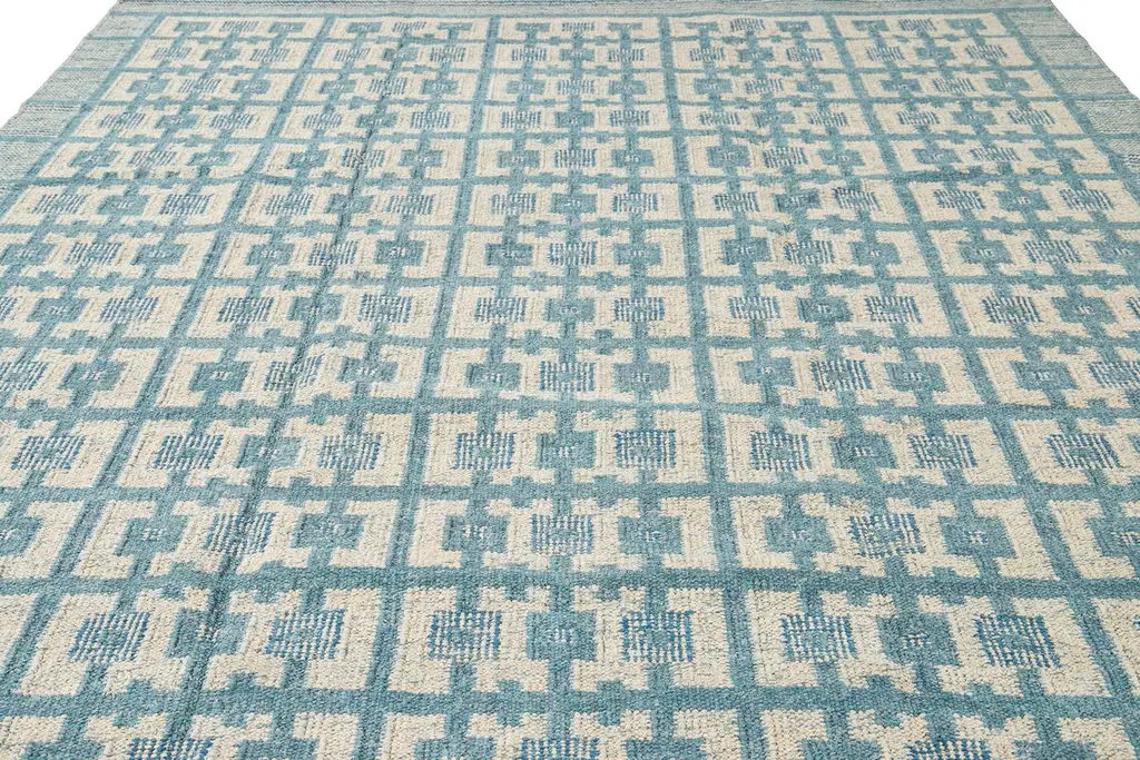 Beautiful modern Swedish style wool rug with a blue field. This Swedish rug has accents of ivory in a gorgeous all-over geometric square pattern design. This rug measures: 9'2" x 12'.Our rugs are professional cleaning before shipping.
