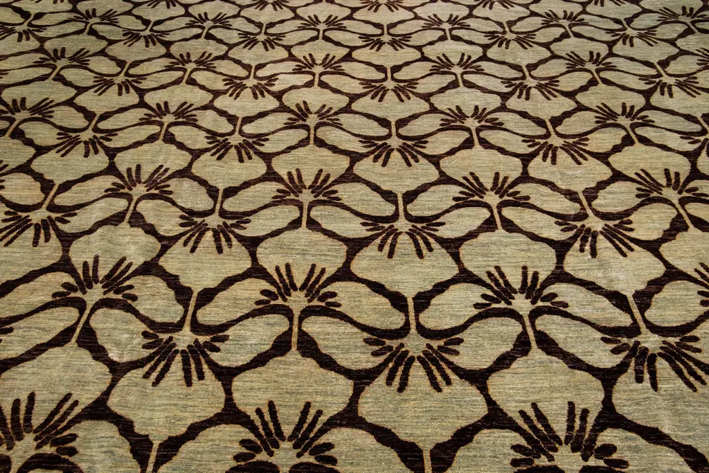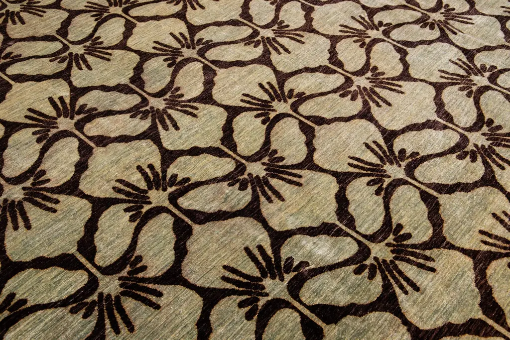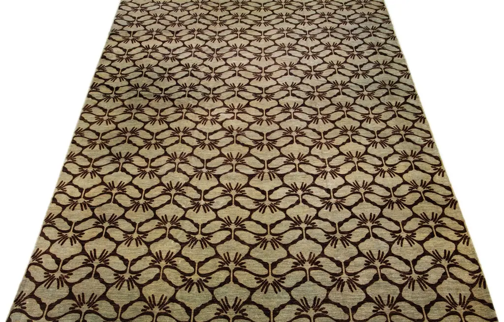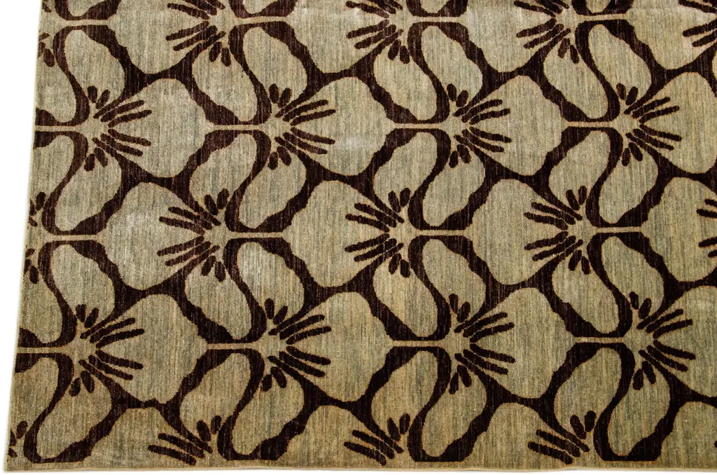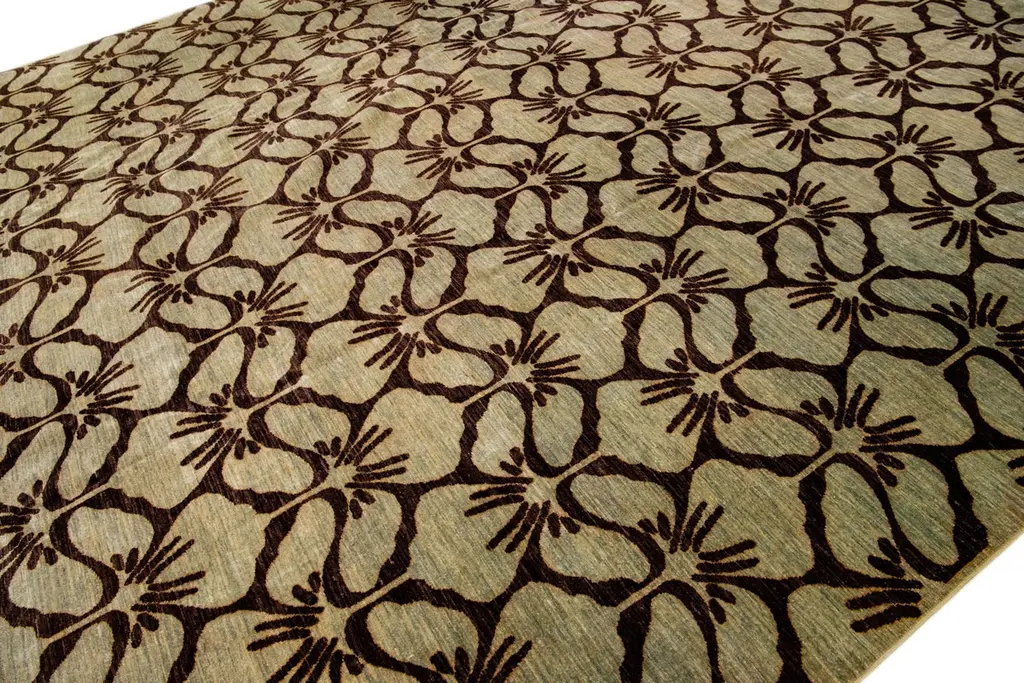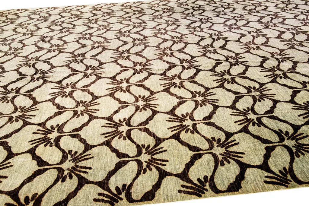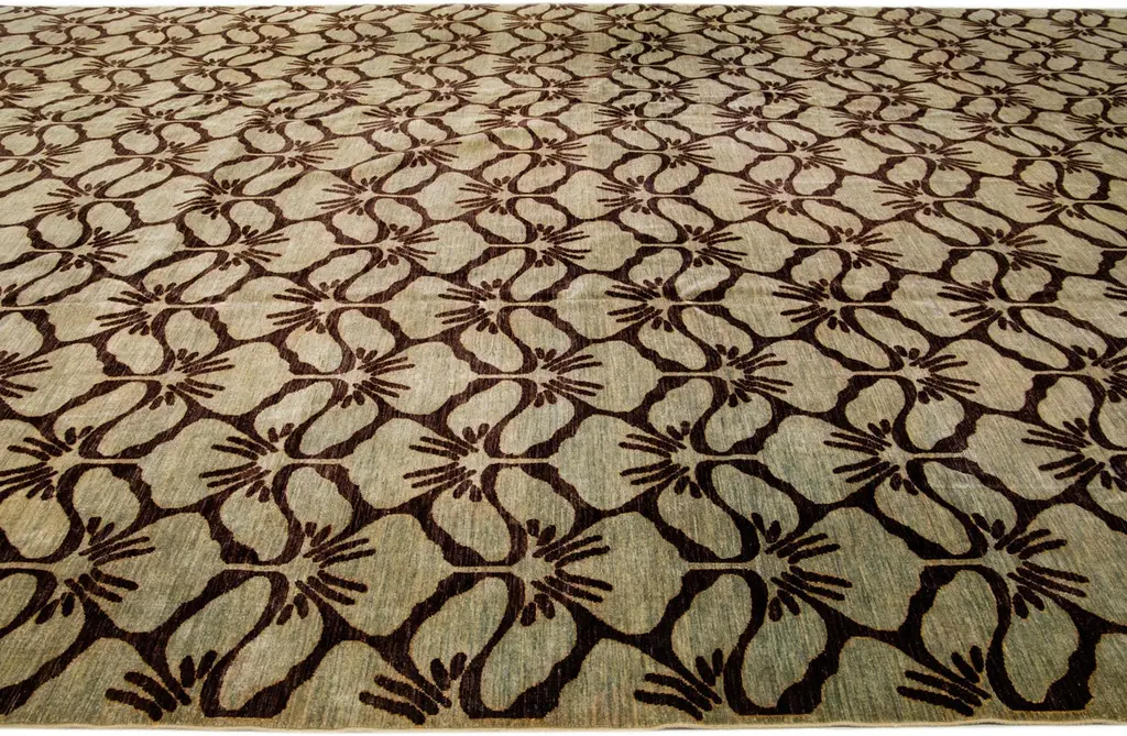 Modern Transitional Handmade Brown Palmettes Pattern Oversize Tan Wool Rug