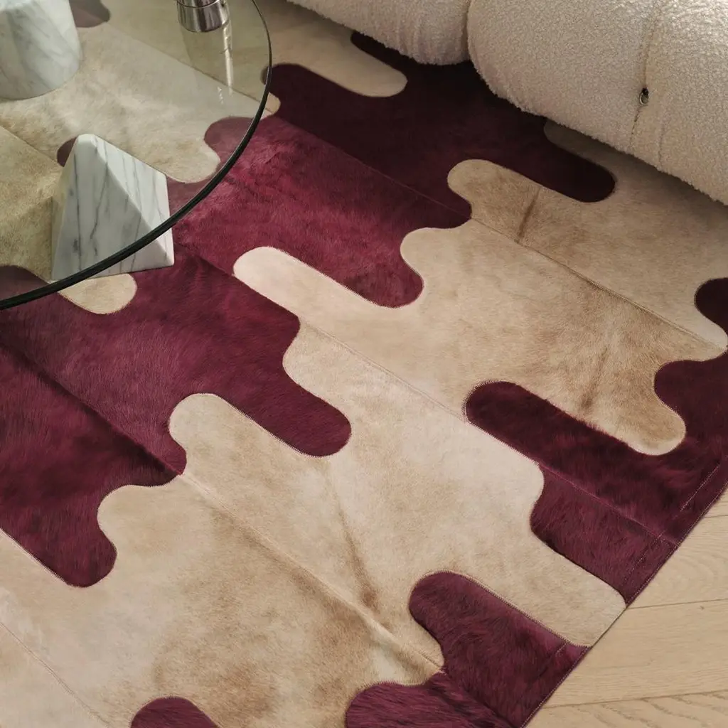 Fresh and modern, the Divina rug was inspired by the famous wave-patterned marble floor from Villa Bussani in Milan. Its fluid two-toned design is simultaneously soft and striking in natural Caramel and inky Plum.The Divina is stitched together using commercial grade nylon thread and features a branded ribbon edge finish. It can easily be customized to any colour, size or shape.The Altro Mondo Collection is a range of hide floor and wall coverings by Greg Natale for Art Hide. Classically stylish with an unconventional twist, Altro Mondo, meaning “other world” in Italian, is inspired by the innovative architecture and radical design ethos of famous Italian discotheques from the 1970s to the 1990s. Drawing from Brutalist, Postmodernist, and Space-Age aesthetics, the collection evokes the bold spirit embodied by these otherworldly spaces. Art Hide rugs are made to order. Please allow 4-6 weeks for delivery.