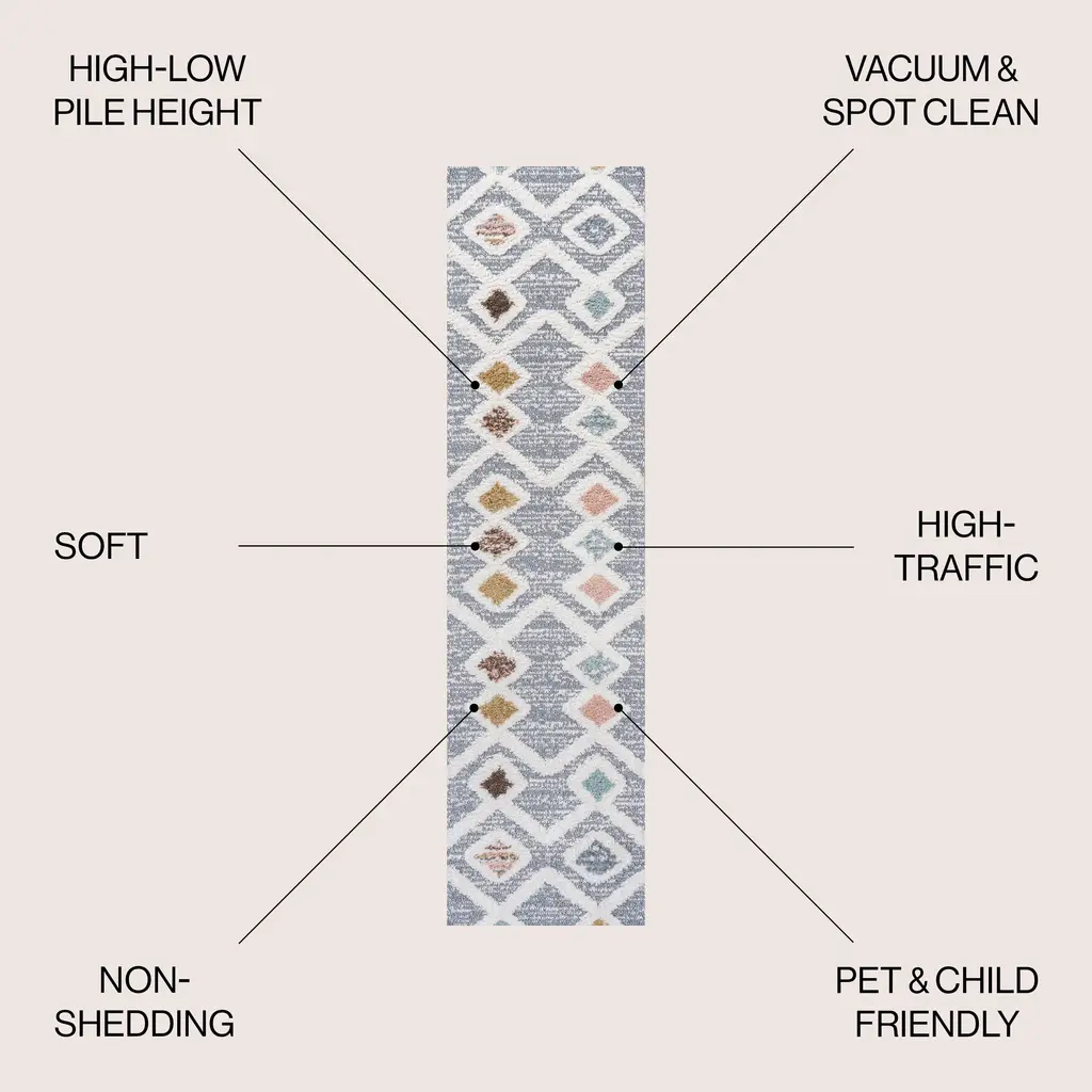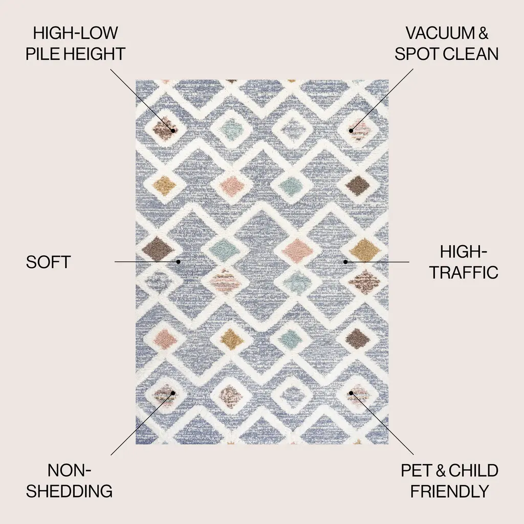 Our updated take on a classic tribal rug pattern features modern, Boho-inspired pastel shades in a geometric trellis design. This versatile rug features two different pile heights for soft texture in the living room, bedroom or home office. Woven from easy-care yarns, this is a family-friendly rug designed to add bold pattern and soft color to mid-century, transitional and modern interiors.