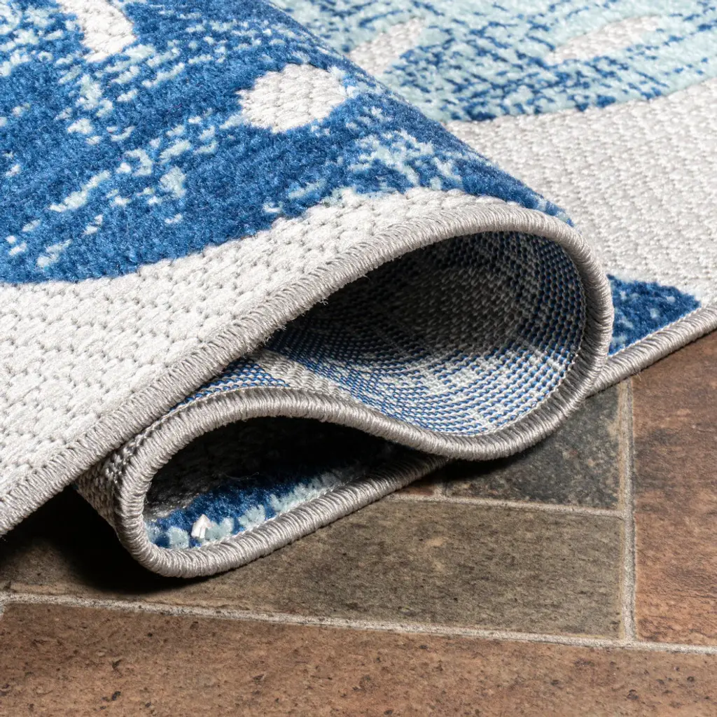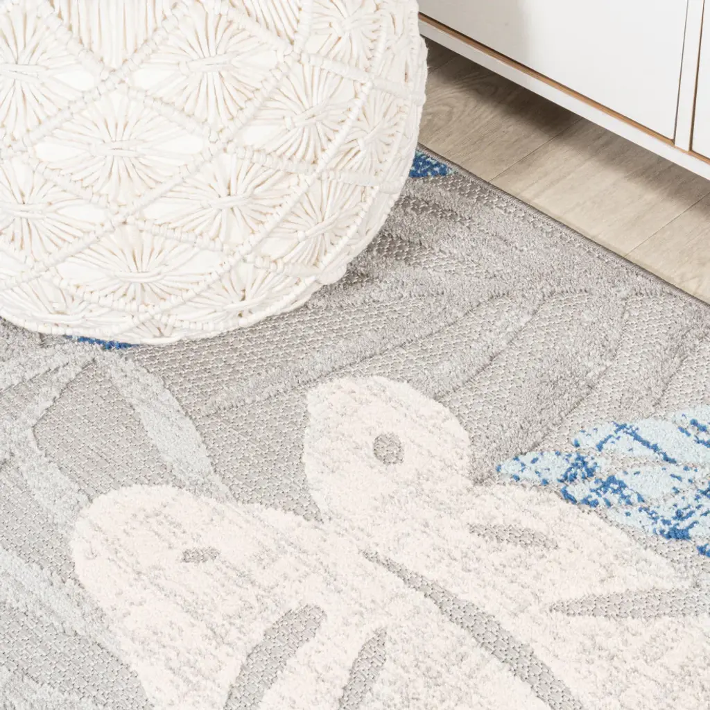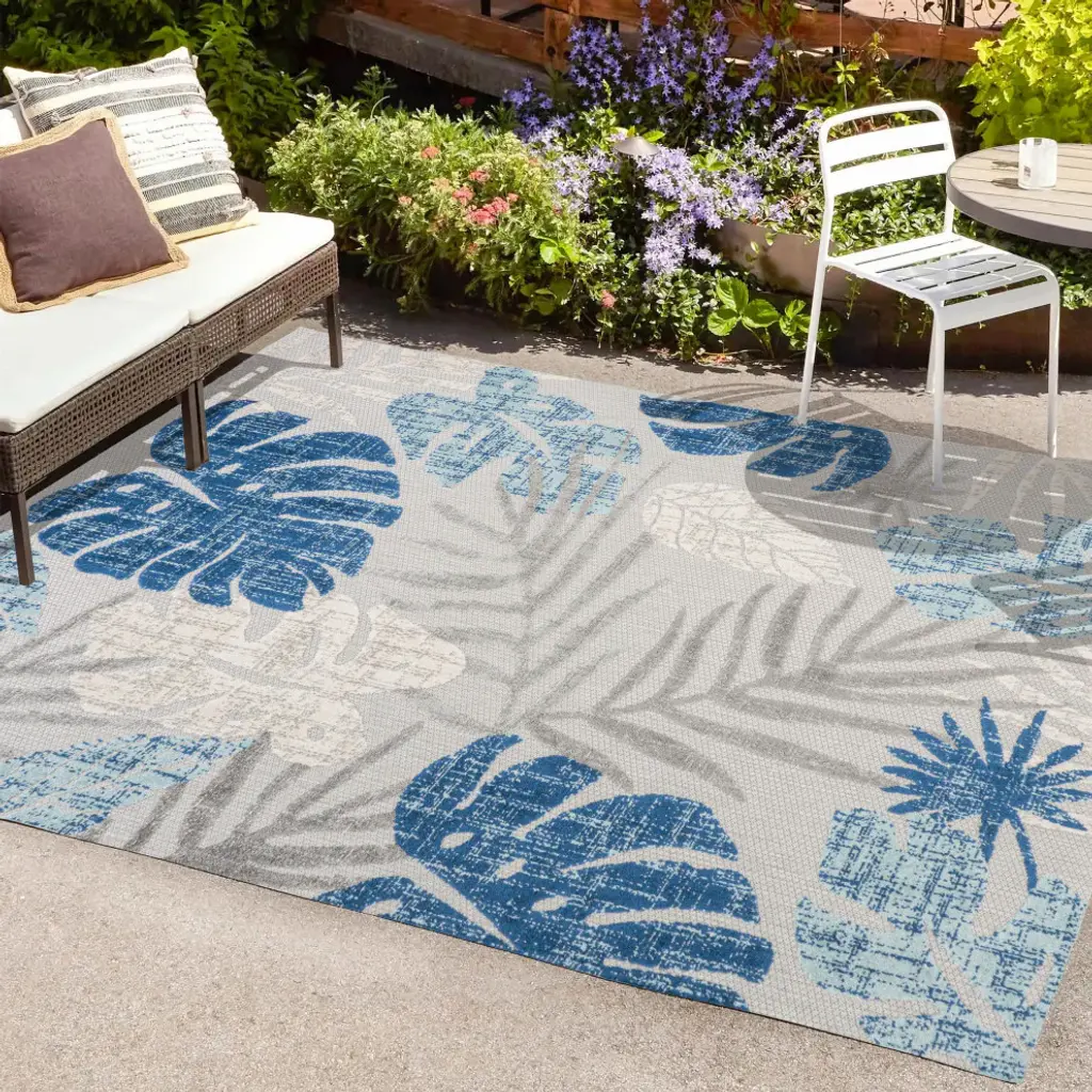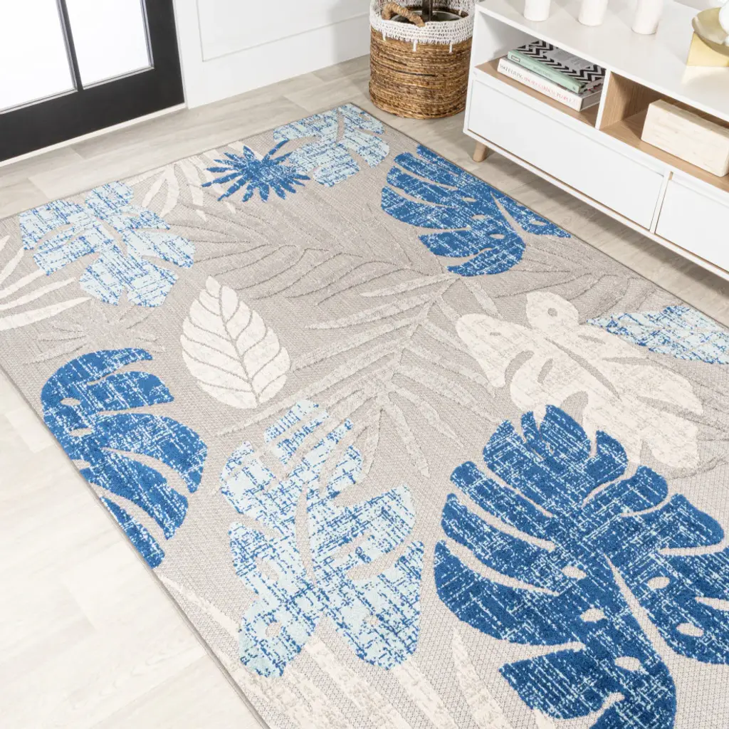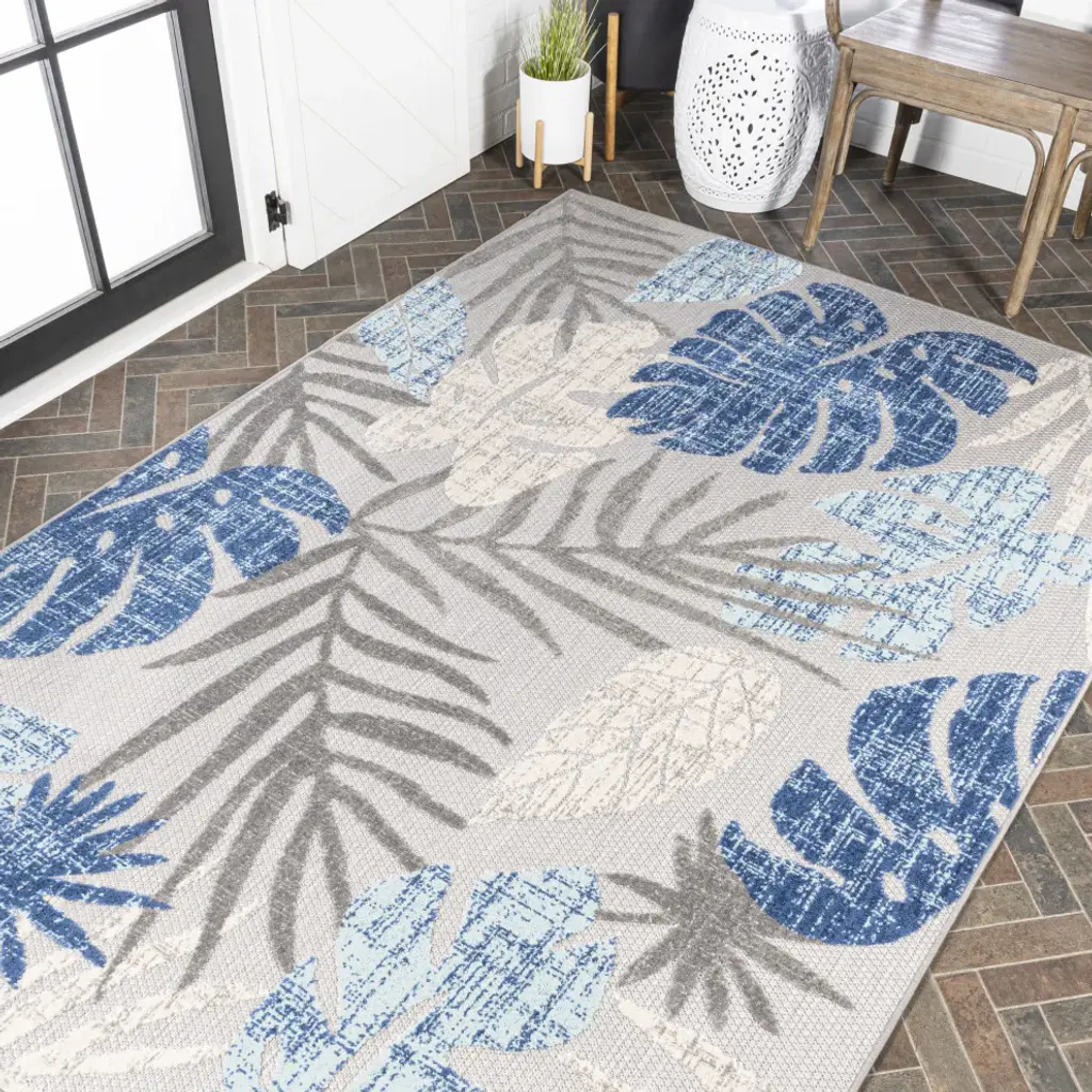 Monstera Tropical Leaf High-Low Indoor/outdoor Area Rug, Light Gray/navy, 5 X 8