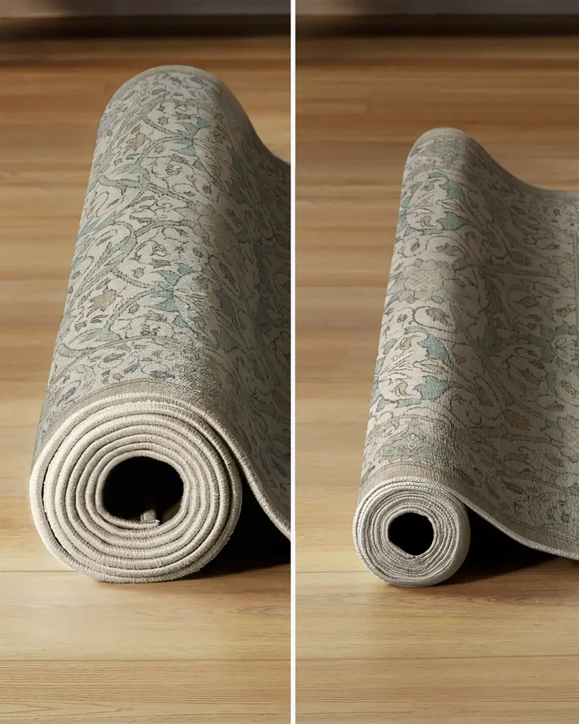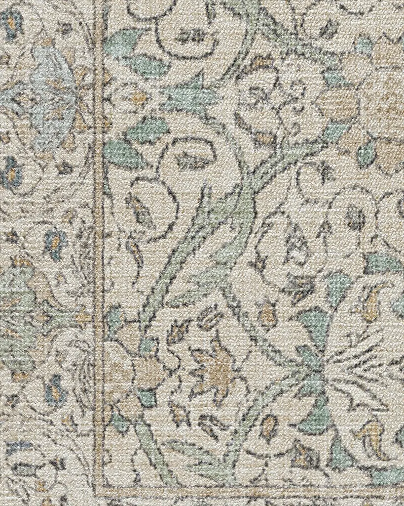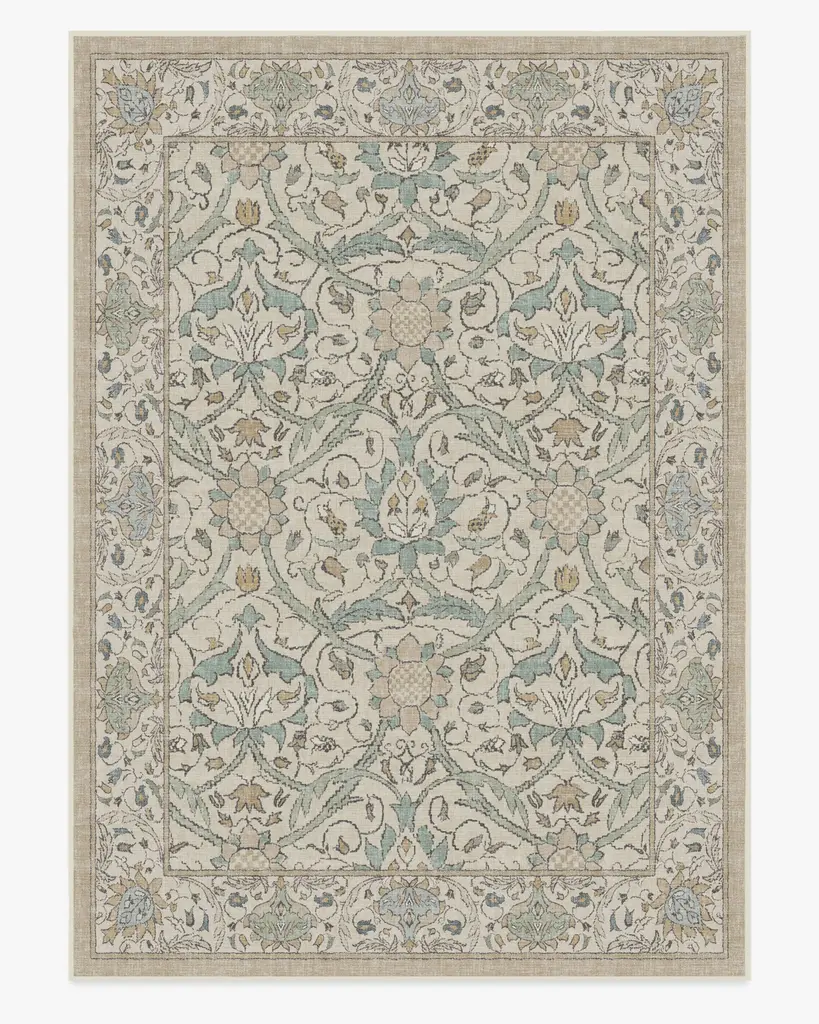 Elevate any space with the Morris & Co. Montreal Natural Jade Rug. This traditional take on John Henry Dearle's 1890's carpet design features simple line work in a soft color palette of beiges, golds, blues, and greens. The trailing vines and floral botanicals add an ornate formality to the detailed design. Water-resistant, stain-resistant, and machine-washable. Rug colors may vary slightly according to your device and the lighting in your space.