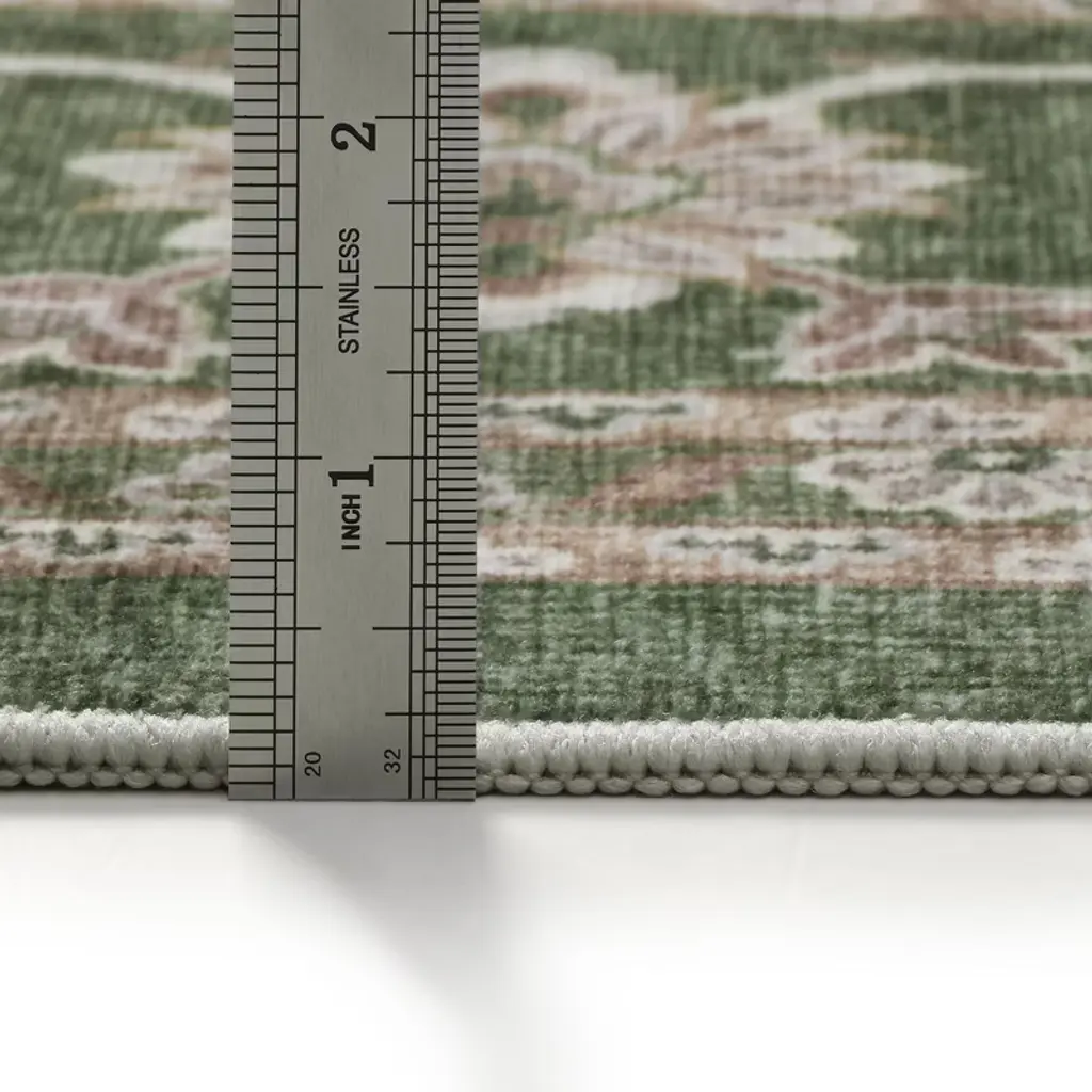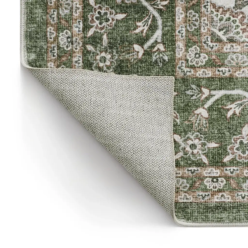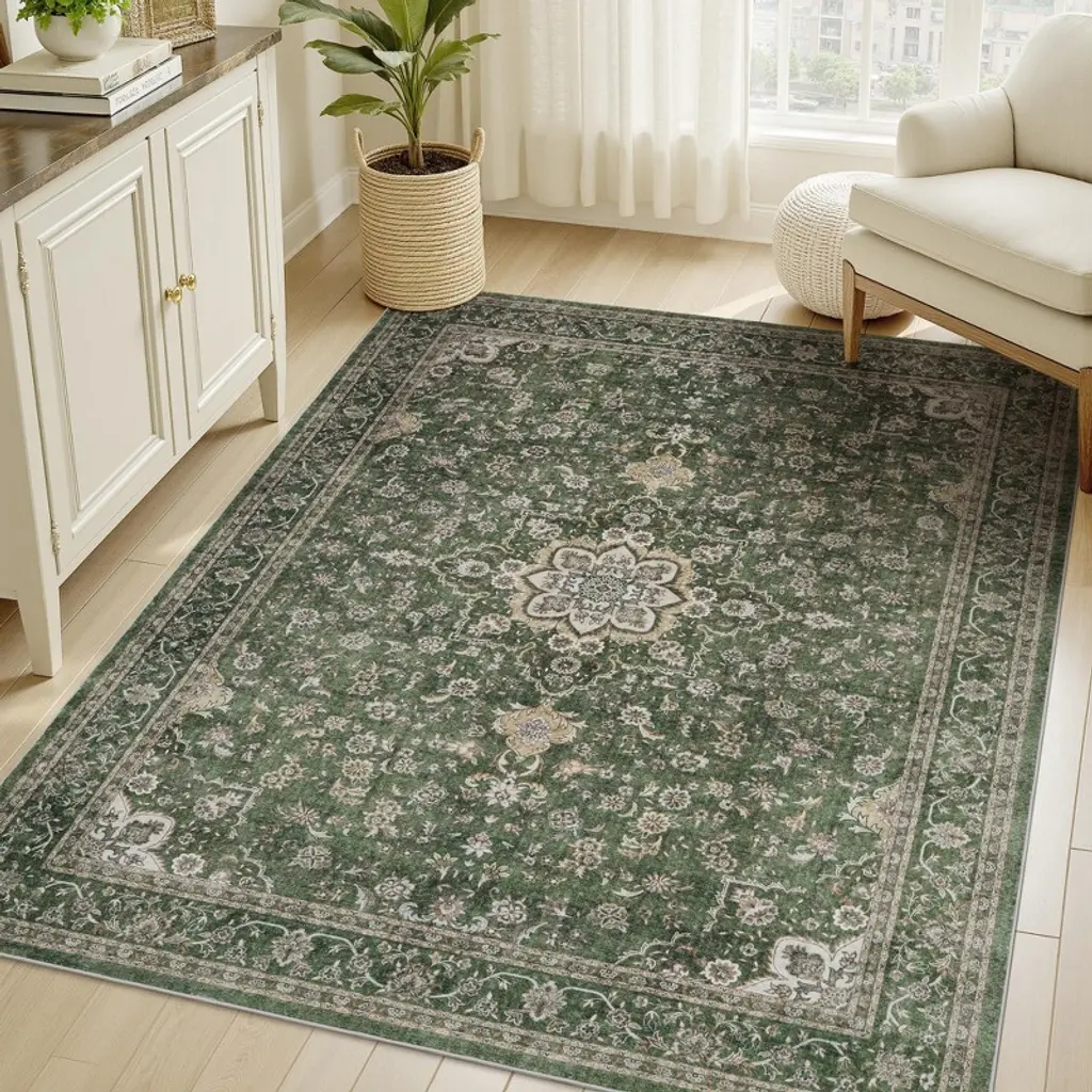 Bring depth and character to your space with this vintage-inspired area rug. Featuring a traditional medallion centerpiece surrounded by intricate floral accents, its rich forest green tones, warm neutrals, and softly faded finish evoke timeless elegance with a grounded, earthy charm. Crafted for comfort with a non-slip backing, it’s ideal for busy households with kids and pets. Both sophisticated and practical, this rug makes a bold yet classic statement in any room.
