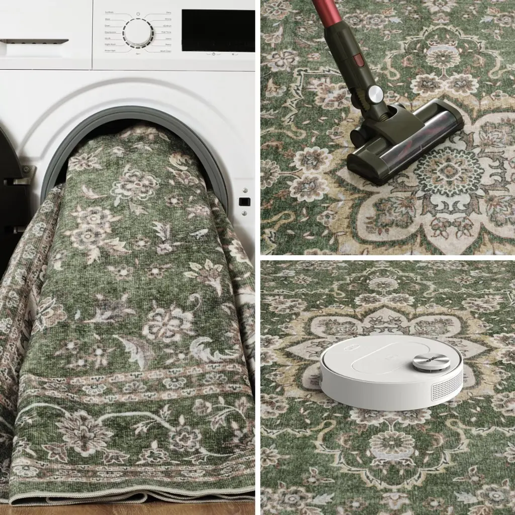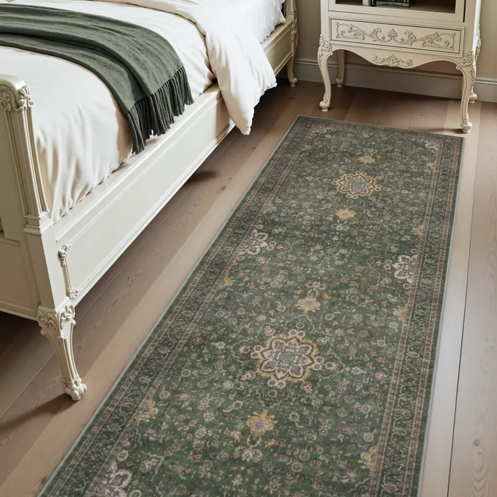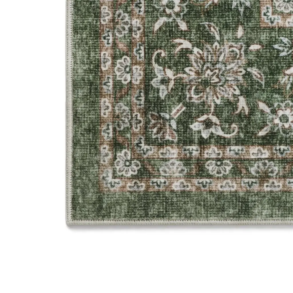 Bring depth and character to your space with this vintage-inspired area rug. Featuring a traditional medallion centerpiece surrounded by intricate floral accents, its rich forest green tones, warm neutrals, and softly faded finish evoke timeless elegance with a grounded, earthy charm. Crafted for comfort with a non-slip backing, it’s ideal for busy households with kids and pets. Both sophisticated and practical, this rug makes a bold yet classic statement in any room.