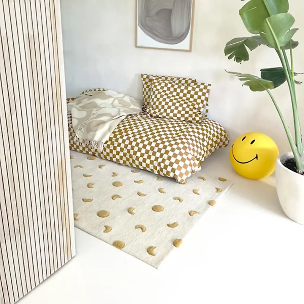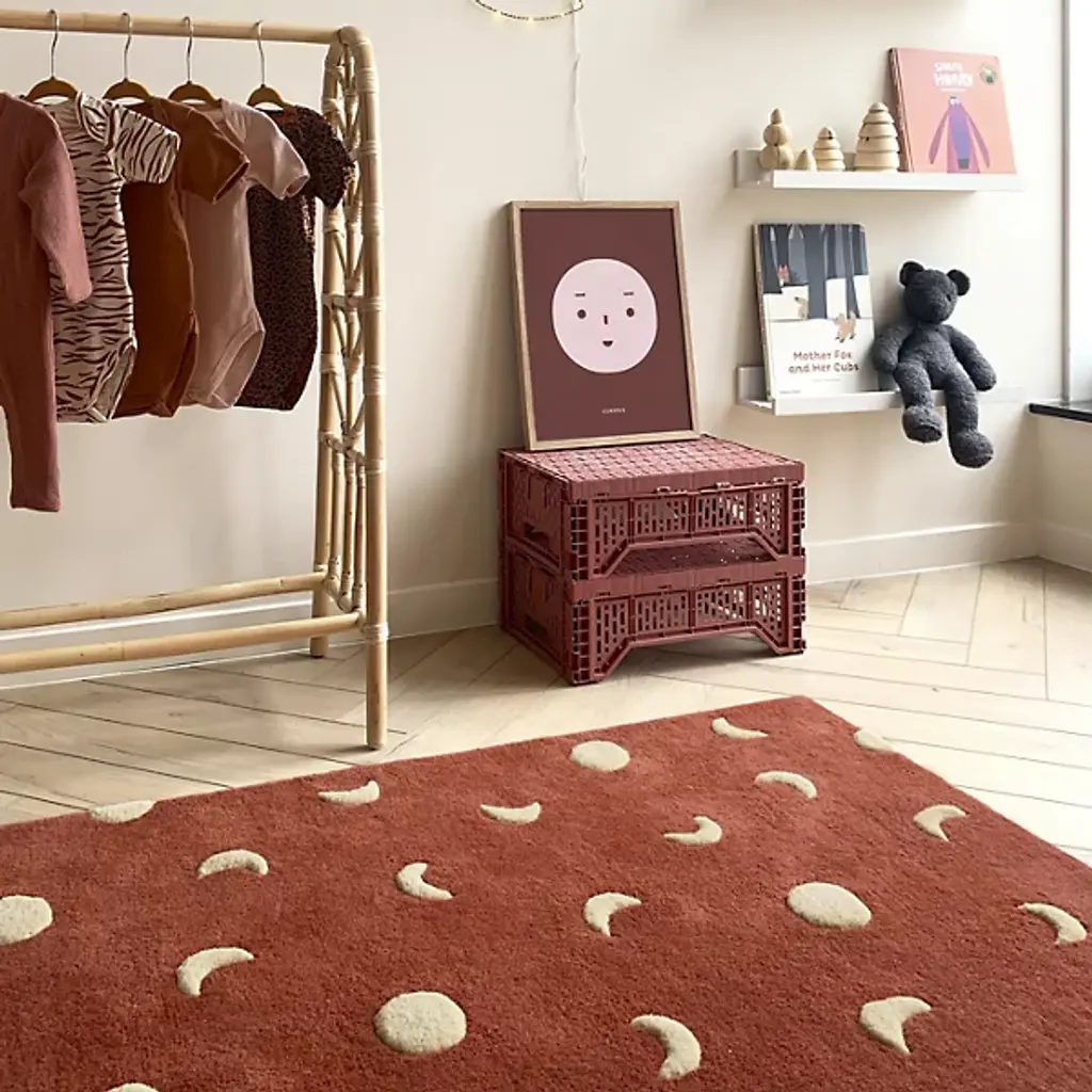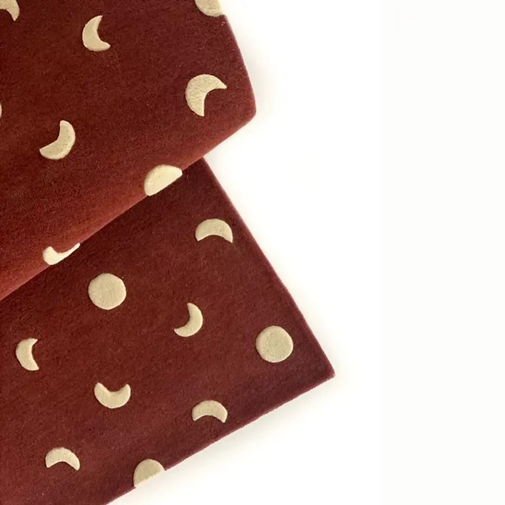 The Moons Area Rug from Maison Deux is a wool rectangle rug featuring a raised moon pattern, hand-tufted for a textured, standout design. Its warm tones bring character and vibrancy to any room. Crafted in India, it’s GoodWeave-certified, ensuring ethical production while supporting programs that educate children and improve working conditions in producer communities.