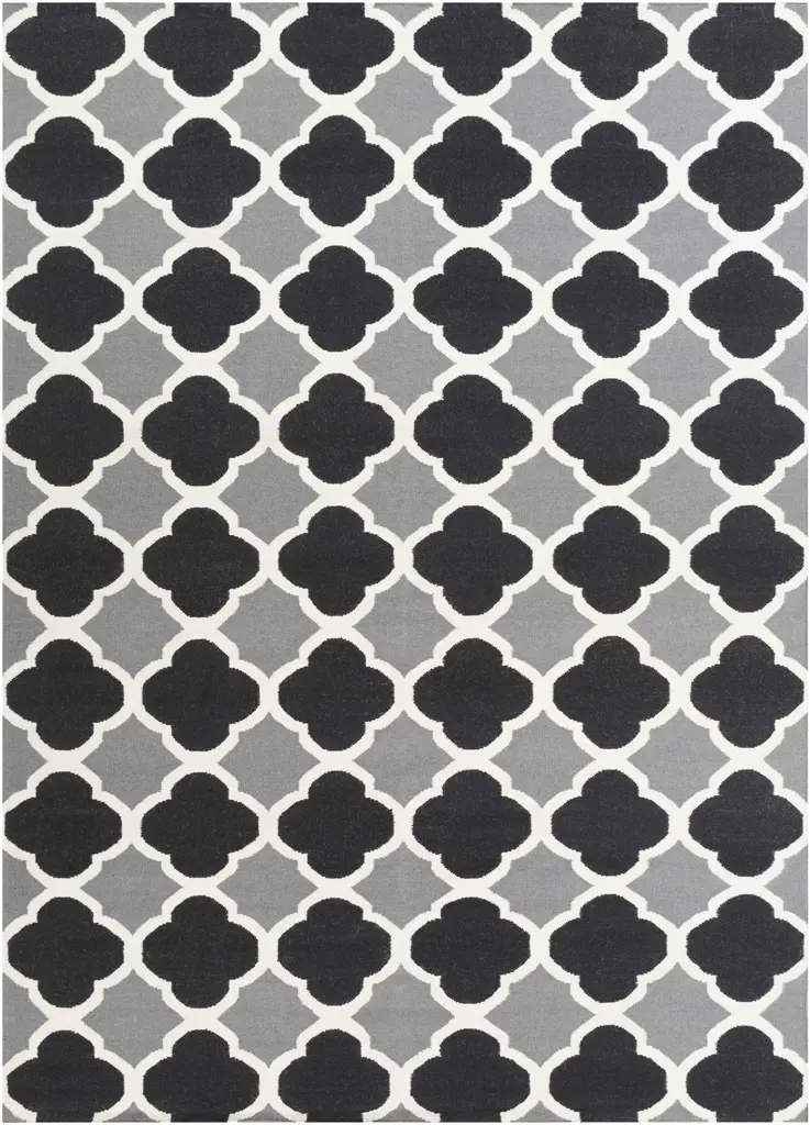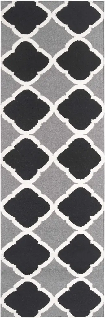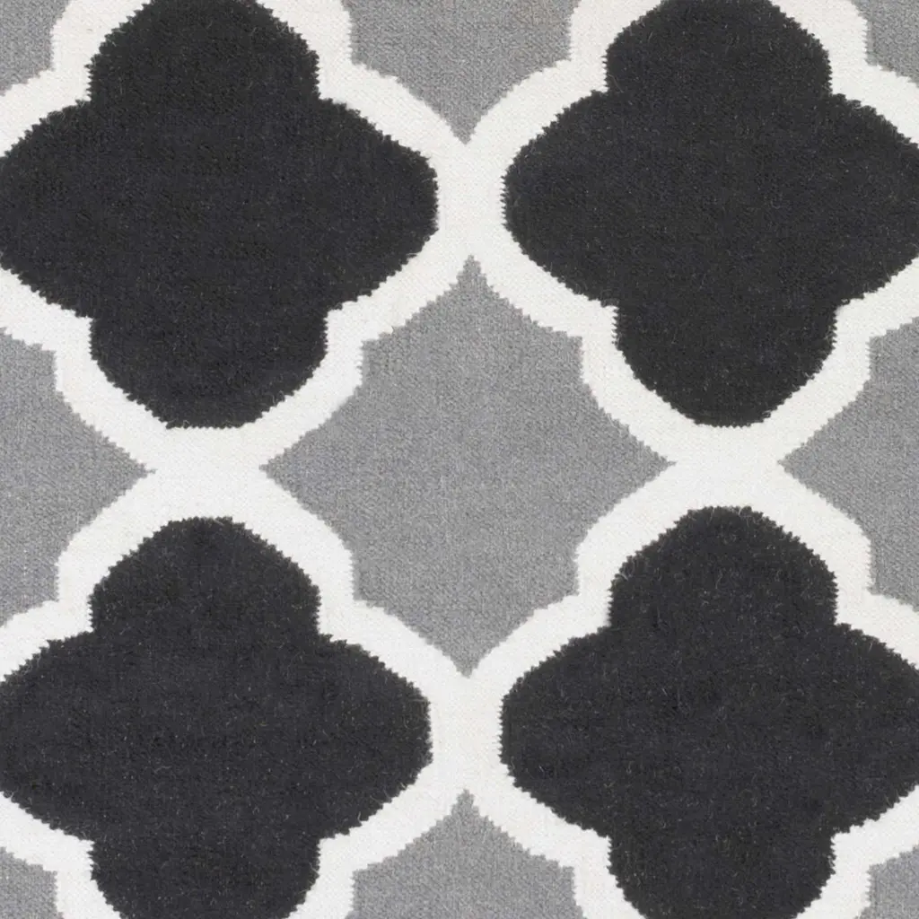 Collection: Moorpark Colors: Black, Gray, Ivory Construction: Hand Woven Material: 100% Wool Pile: No Pile Styles: Transitional Made In: India Thickness: 0.16" Price Range: $$$$$ (Most Affordable)