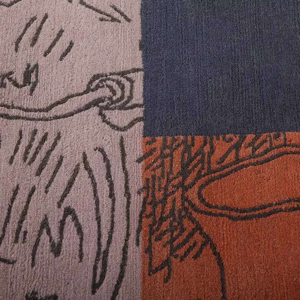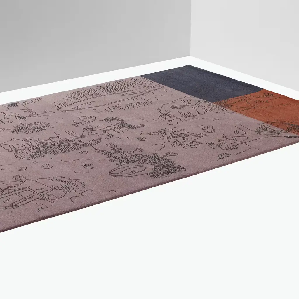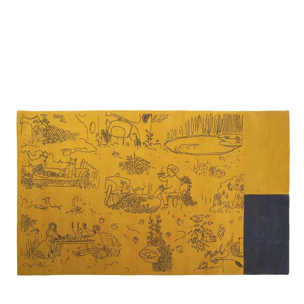 This intriguing rug designed by Luca Nichetto in 2013 is a playful and refreshing take on traditional rugs. Evoking the whimsical works of modern artist Paul Klee, this rectangular rug is dominated by seemingly sketched-out scenes from everyday life, the graphic and carefree quality of the drawings giving the rug a romantic allure. Set on a white background, the rug boasts two color blocks in orange and blue along the bottom edge, adding a touch of color to this versatile accent piece. Entirely hand-knotted in Nepal, this wool rug features 120 knots per inch with 6mm-high pile.