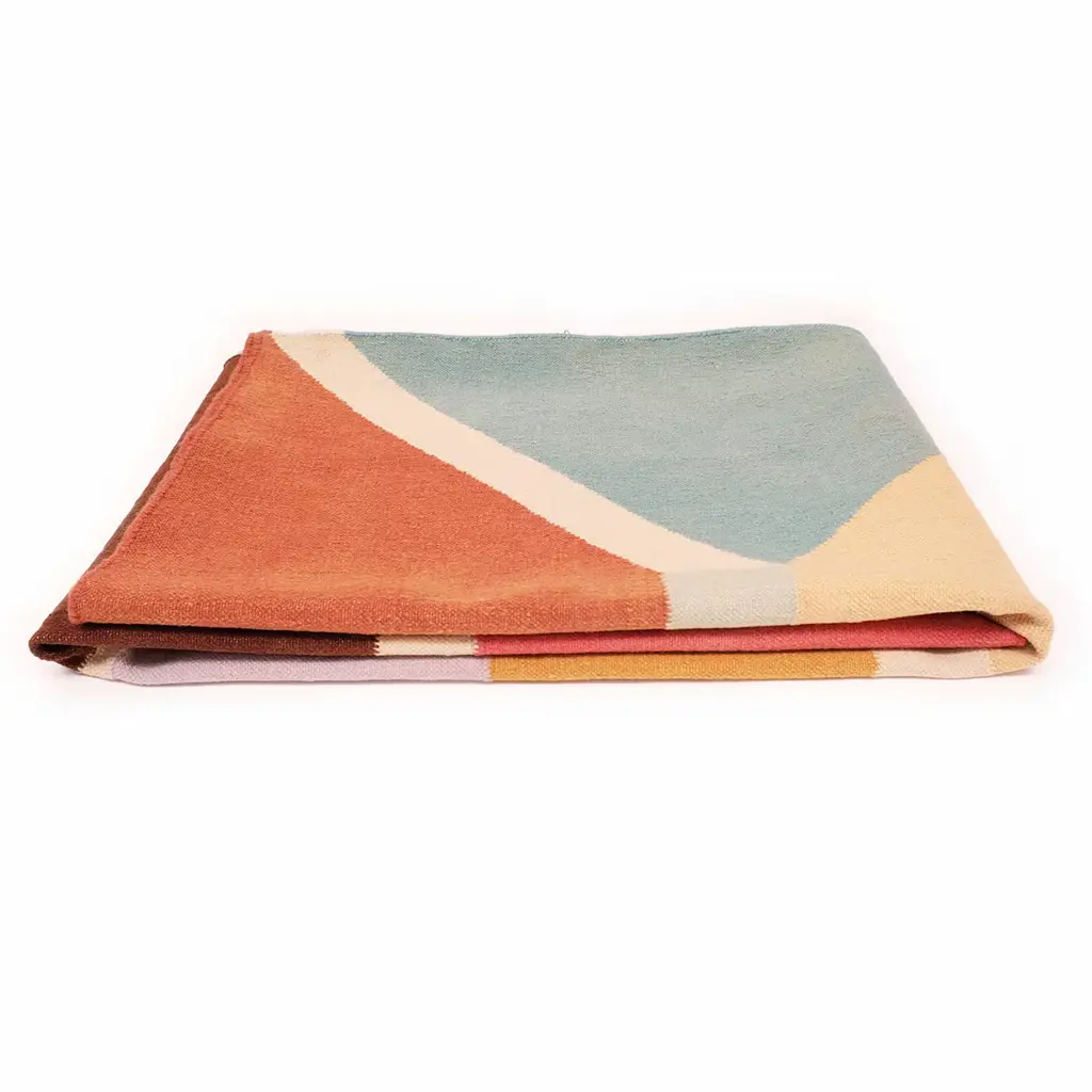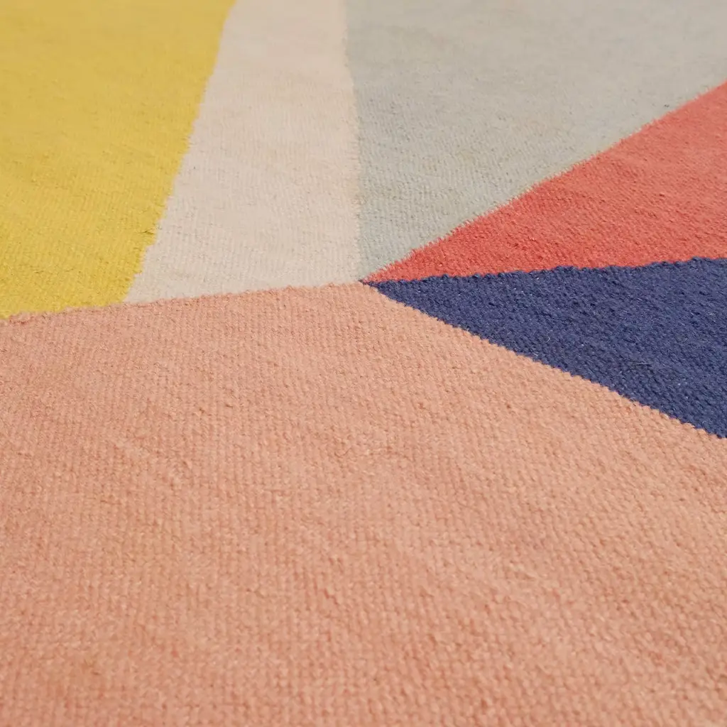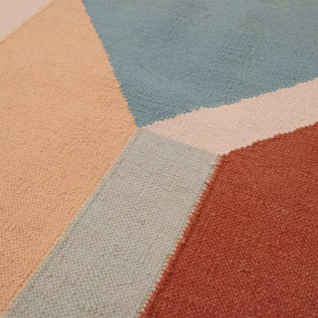 This carpet shows a unique compostion of geometric shapes. The pattern is enhanced by earthy tones that remind the hues of the sunset. The dreamy architecture represented on the wool carpet creates and elegant element for any interior space.