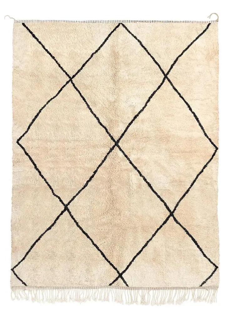 We exclusively create custom individual rugs for you. This means that we do not produce unnecessary items and we prioritize respecting nature. That's why we estimate it will take us around 8-9 weeks to create your rug.Beni Mrirt rugs are made of 100% soft and tender highest quality sheep wool, which is carefully gathered and taken care of. The Beni Mrirt rugs are considered to be the diamond of the Moroccan carpets collections well-deserved due to their superior quality. At first glance, Beni Mrirt and Beni Ourain look similar, but there is still a significant difference between them. The Beni Mrirt rug knot-tying technique varies by its fine weaving which is done more tightly. Ornaments and color palettes are different too. Except for widely used geometrical prints, carpets can be decorated with abstract compositions and the traditional Berber symbols of different colors: from black and brown to indigo and ochre.