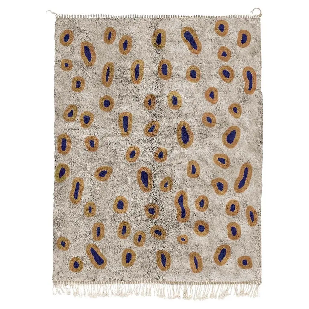 Size: 10’x14’ / 305x430 cm. Upon your request, we will make this rug in any size you need.We exclusively create custom individual rugs for you. This means that we do not produce unnecessary items and we prioritize respecting nature. That's why we estimate it will take us around 11-12 weeks to create your rug.Beni Mrirt rugs are made of 100% soft and tender highest quality sheep wool, which is carefully gathered and taken care of. The Beni Mrirt rugs are considered to be the diamond of the Moroccan carpets collections well-deserved due to their superior quality. At first glance, Beni Mrirt and Beni Ourain look similar, but there is still a significant difference between them. The Beni Mrirt rug knot-tying technique varies by its fine weaving which is done more tightly. Ornaments and color palettes are different too. Except for widely used geometrical prints, carpets can be decorated with abstract compositions and the traditional Berber symbols of different colors: from black and brown to indigo and ochre.