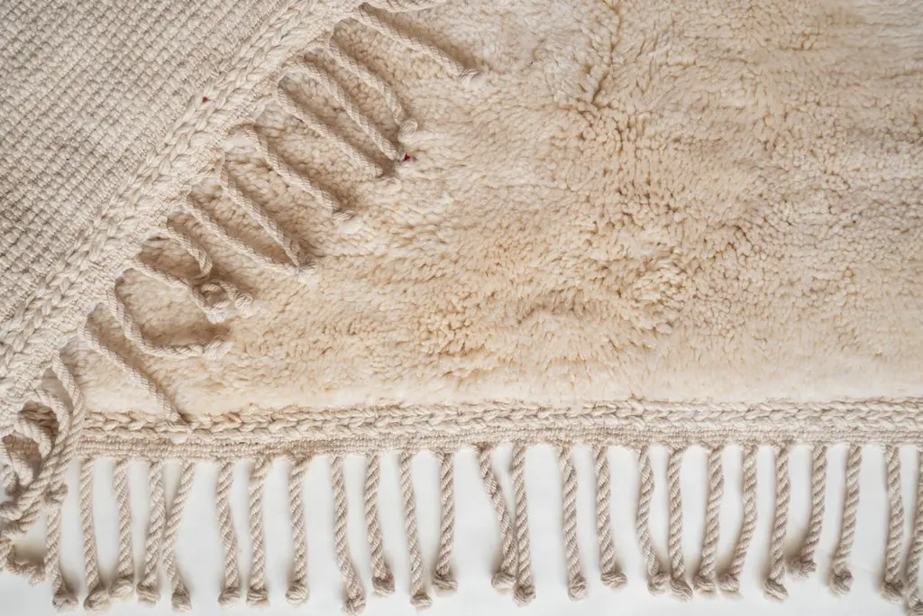 We exclusively create custom, individual rugs for you. This means we do not produce unnecessary items, and we prioritize respecting nature.Beni Mrirt rugs are made from 100% soft and high-quality sheep's wool, carefully gathered and maintained. These rugs are considered the diamonds of Moroccan carpet collections, thanks to their exceptional quality. At first glance, Beni Mrirt and Beni Ourain rugs may seem similar, but there are significant differences between them. The knot-tying technique of the Beni Mrirt rug is finer, with tighter weaving. The ornaments and color palettes also differ.In addition to widely used geometric patterns, these rugs can be adorned with abstract compositions and traditional Berber symbols in various colors, ranging from black and brown to indigo and ochre. Please note that after the final finishing process, slight variations in color shades and size may occur.