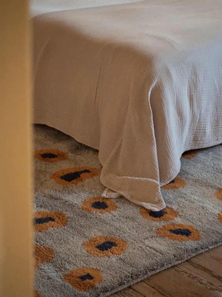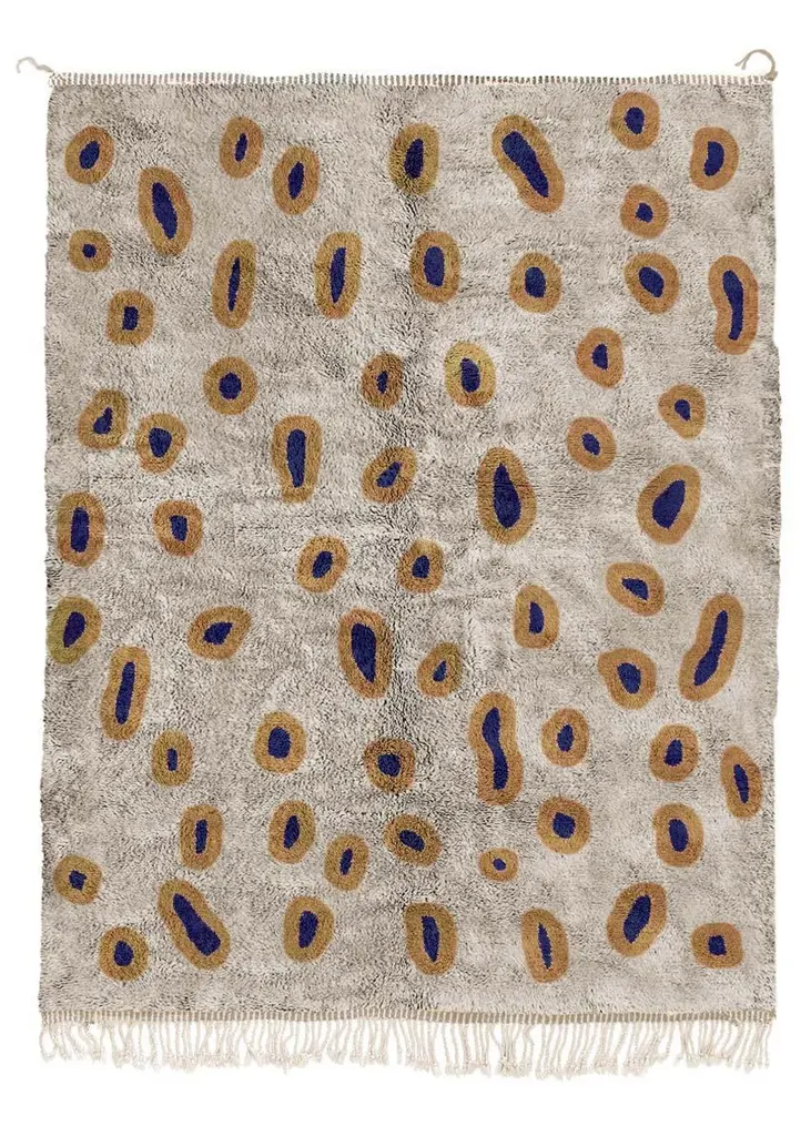 Size: 5'x7’ / 155x215 cm. Upon your request, we will make this rug in any size you need.We exclusively create custom individual rugs for you. This means that we do not produce unnecessary items and we prioritize respecting nature. That's why we estimate it will take us around 11-12 weeks to create your rug.Beni Mrirt rugs are made of 100% soft and tender highest quality sheep wool, which is carefully gathered and taken care of. The Beni Mrirt rugs are considered to be the diamond of the Moroccan carpets collections well-deserved due to their superior quality. At first glance, Beni Mrirt and Beni Ourain look similar, but there is still a significant difference between them. The Beni Mrirt rug knot-tying technique varies by its fine weaving which is done more tightly. Ornaments and color palettes are different too. Except for widely used geometrical prints, carpets can be decorated with abstract compositions and the traditional Berber symbols of different colors: from black and brown to indigo and ochre.