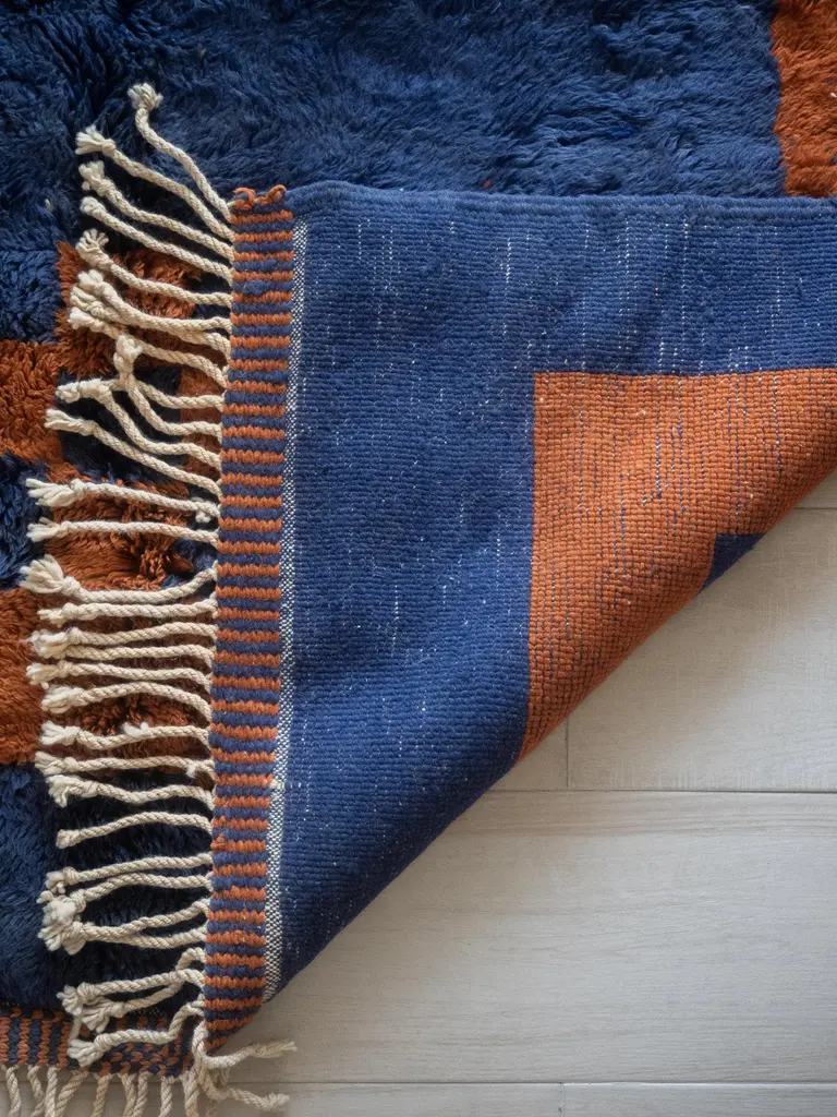 We exclusively create custom individual rugs for you. This means that we do not produce unnecessary items and we prioritize respecting nature. That's why we estimate it will take us around 8-9 weeks to create your rug.Beni Mrirt rugs are made of 100% soft and tender highest quality sheep wool, which is carefully gathered and taken care of. The Beni Mrirt rugs are considered to be the diamond of the Moroccan carpets collections well-deserved due to their superior quality. At first glance, Beni Mrirt and Beni Ourain look similar, but there is still a significant difference between them. The Beni Mrirt rug knot-tying technique varies by its fine weaving which is done more tightly. Ornaments and color palettes are different too. Except for widely used geometrical prints, carpets can be decorated with abstract compositions and the traditional Berber symbols of different colors: from black and brown to indigo and ochre.