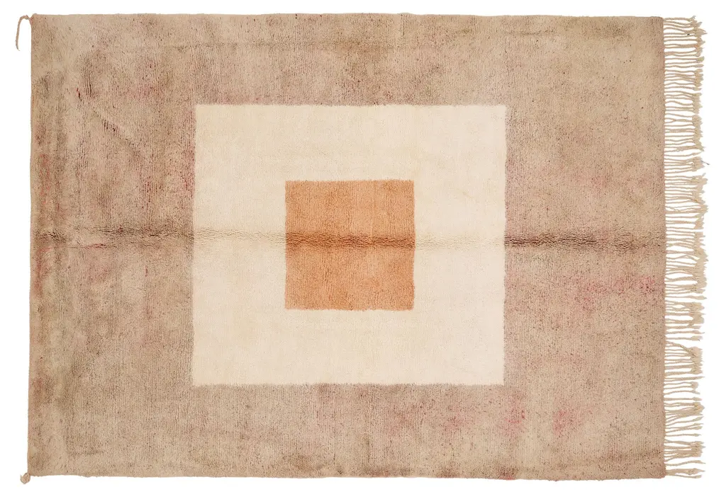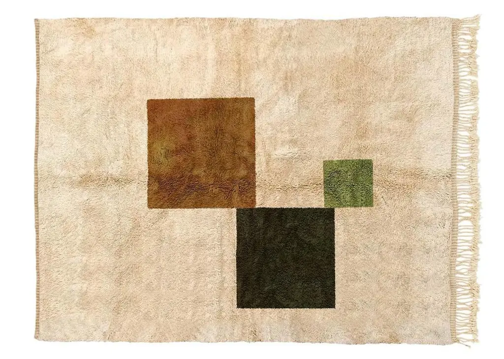 Size: 8’x10’ / 245x305 cm. We will weave this rug in any size for you. Just let us know what size you need.We exclusively create custom individual rugs for you. This means that we do not produce unnecessary items and we prioritize respecting nature. That's why we estimate it will take us around 11-12 weeks to create your rug.Beni Mrirt rugs are made of 100% soft and tender highest quality sheep wool, which is carefully gathered and taken care of. The Beni Mrirt rugs are considered to be the diamond of the Moroccan carpets collections well-deserved due to their superior quality. At first glance, Beni Mrirt and Beni Ourain look similar, but there is still a significant difference between them. The Beni Mrirt rug knot-tying technique varies by its fine weaving which is done more tightly. Ornaments and color palettes are different too. Except for widely used geometrical prints, carpets can be decorated with abstract compositions and the traditional Berber symbols of different colors: from black and brown to indigo and ochre.