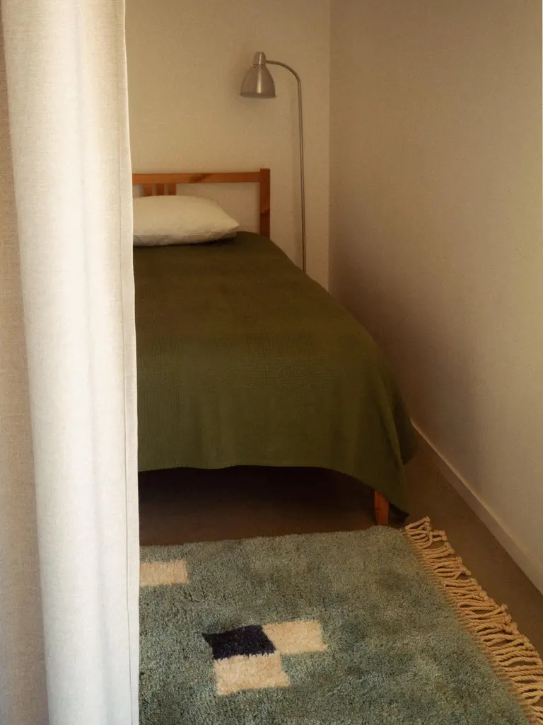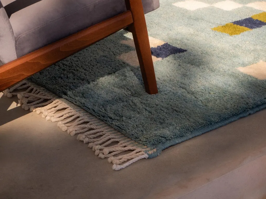 We exclusively create custom individual rugs for you. This means that we do not produce unnecessary items and we prioritize respecting nature. That's why we estimate it will take us around 11-12 weeks to create your rug.Beni Mrirt rugs are made of 100% soft and tender highest quality sheep wool, which is carefully gathered and taken care of. The Beni Mrirt rugs are considered to be the diamond of the Moroccan carpets collections well-deserved due to their superior quality. At first glance, Beni Mrirt and Beni Ourain look similar, but there is still a significant difference between them. The Beni Mrirt rug knot-tying technique varies by its fine weaving which is done more tightly. Ornaments and color palettes are different too. Except for widely used geometrical prints, carpets can be decorated with abstract compositions and the traditional Berber symbols of different colors: from black and brown to indigo and ochre.