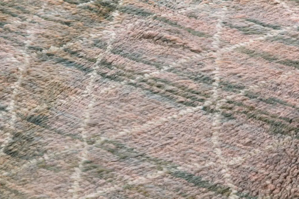 A contemporary hand-knotted Moroccan wool rug with soft, lush, velvety pile in forest green, blue, bluish gray and turquoise colors.The rug can be custom produced in a different size, color combination, any pattern and weave any design in approximately 5 weeks.