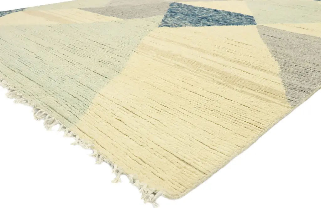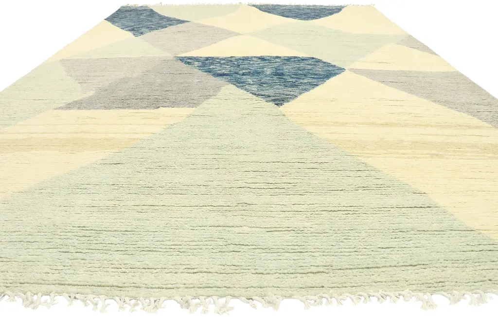 With its subtle yet expressive design, incredible detail and texture, this contemporary Moroccan area rug is a captivating vision of woven beauty showcasing Scandinavian boho chic design style with Hygge vibes. The abrashed field features an all-over geometric pattern composed of a myriad of alternating triangles, diamonds, lozenges, and diagonal rectangles. Displaying a charming and almost quilt-like appearance and the embodiment of Scandi style, this Moroccan rug is poised to impress.