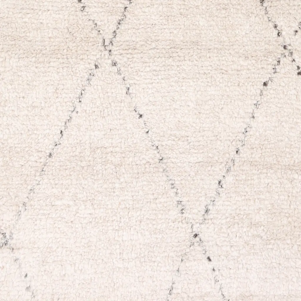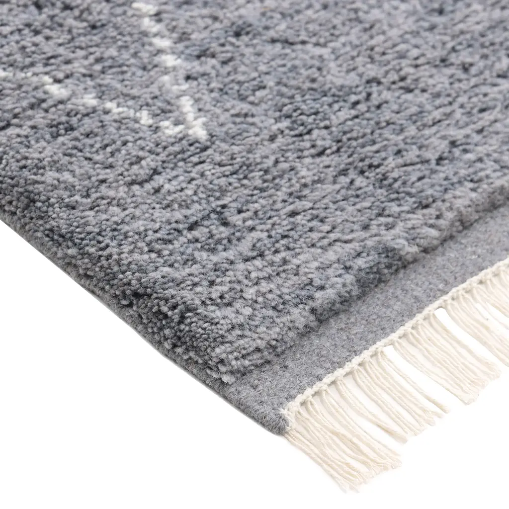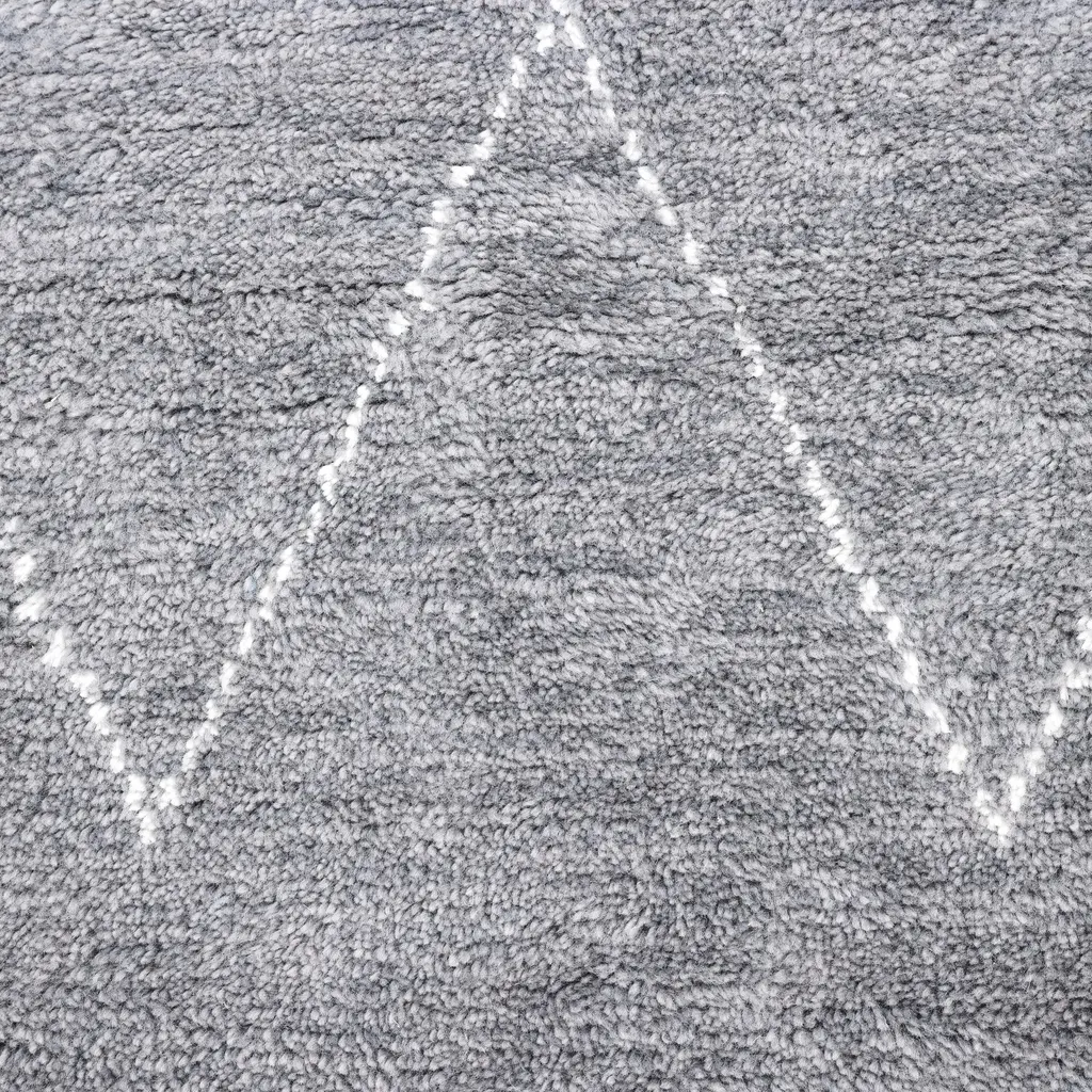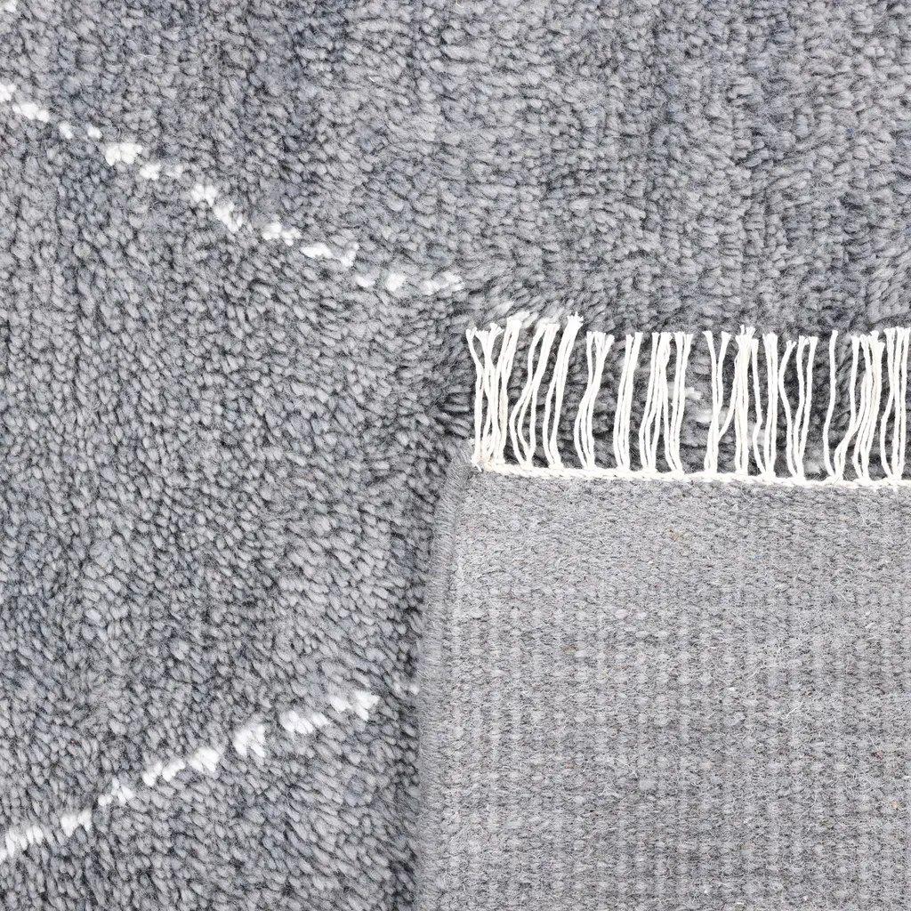This 8' x 10' Moroccan-style area rug offers a blend of classic design and practical function. Crafted from 100% natural wool, this rug features a soft, dense pile that provides comfort and durability. The design showcases a repeating white geometric diamond pattern set against a contemporary grey background, complemented by subtle fringed edges. Constructed for lasting use, the wool material is known for its resilience and ability to withstand foot traffic, making it suitable for various spaces within the home. Its natural fibers also offer inherent insulation properties and are naturally flame resistant. The grey and white color palette provides a versatile foundation that can integrate with modern, minimalist, or eclectic decor styles. Ideal for anchoring a living room seating arrangement, defining a dining area, or adding warmth to a master bedroom, this 8' x 10' rug provides substantial coverage. Each rug is skillfully made in India, reflecting traditional craftsmanship adapted for contemporary interiors. To maintain its appearance, regular vacuuming is recommended, and professional cleaning should be considered for deeper maintenance.