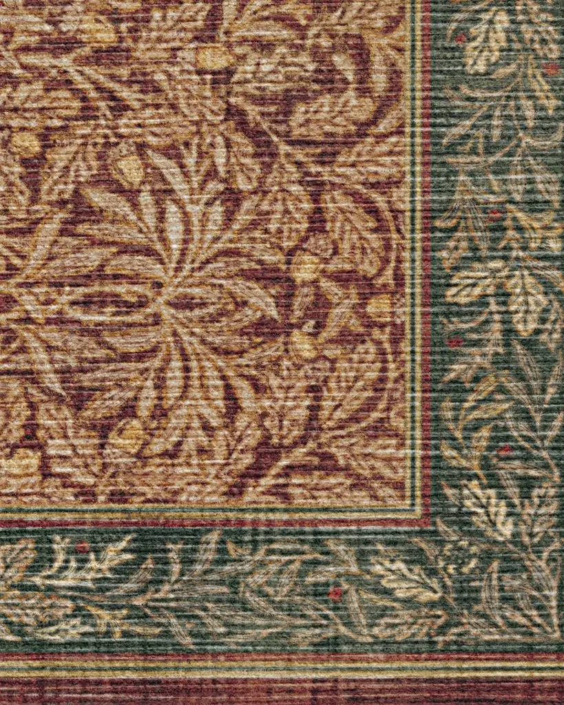 Celebrate the season with our Morris & Co. Acorn Amber Red Rug. This traditional red style showcases a pattern of acorn branches, faithfully recreated from the original 1879 Morris & Co. hand printing blocks. The rich red center is adorned with elegant gold and cream motifs, while a deep green border with gold accents enriches the overall design. The velvety textures of the reds and greens enhance the rug's rich aesthetic, making it ideal for festive occasions and everyday elegance. Water-resistant, stain-resistant, and machine-washable. Rug colors may vary slightly according to your device and the lighting in your space.