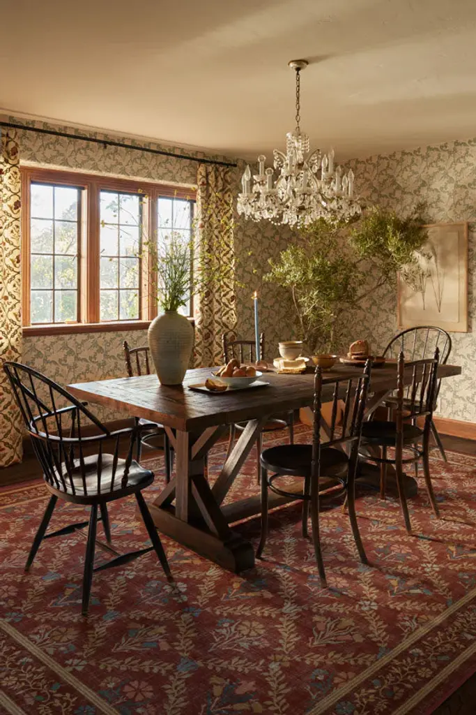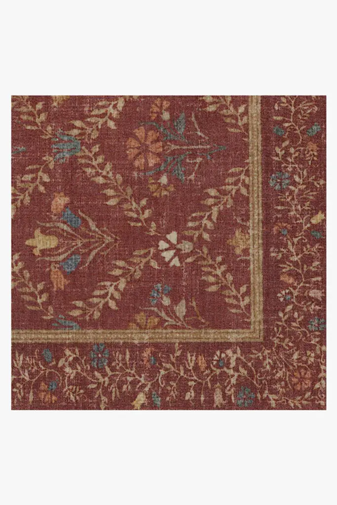 Gaze at the organic beauty of the Morris & Co. Bellflowers Amber Red Rug. Our interpretation of William Morris's famed carpet design from the late 1800s, this rug boasts a beautiful lattice vine design and delicate bouquets that evoke the promise of spring. A harmonious border of floral buds and leaves frames the design in intricate detail. Rich red grounds the design, while softened pops of coral, yellow, and blue make it sing. Water-resistant, stain-resistant, and machine-washable. Rug colors may vary slightly according to your device and the lighting in your space.
