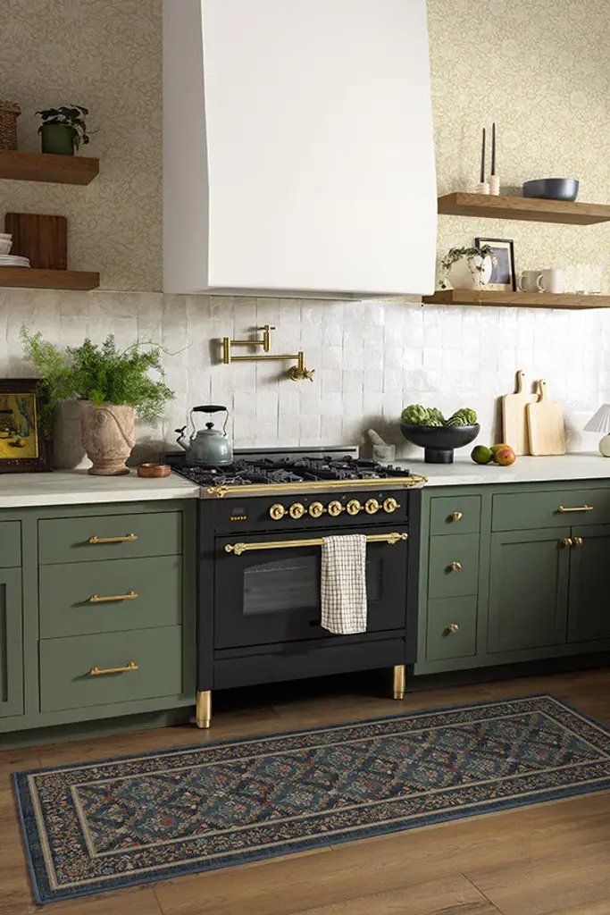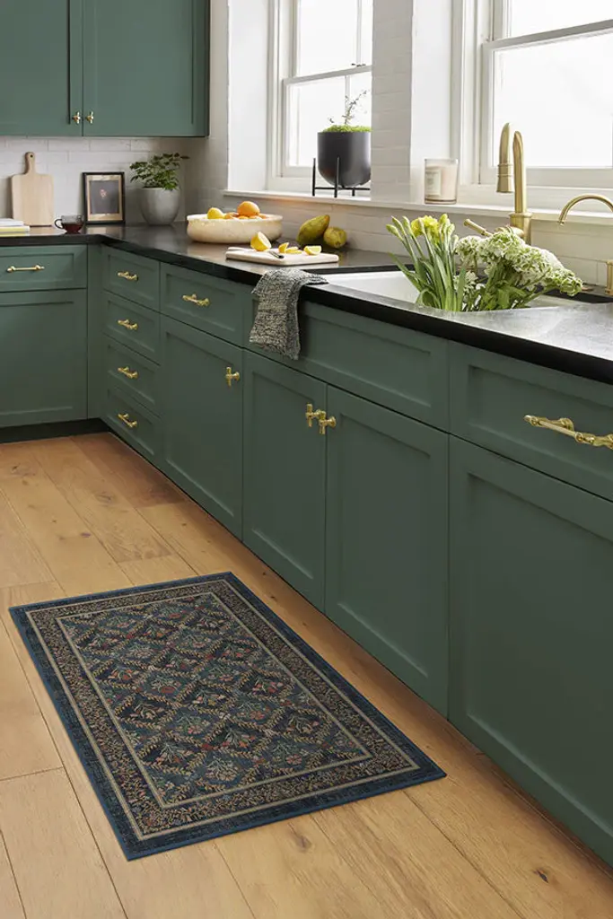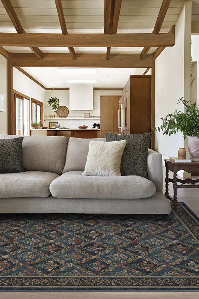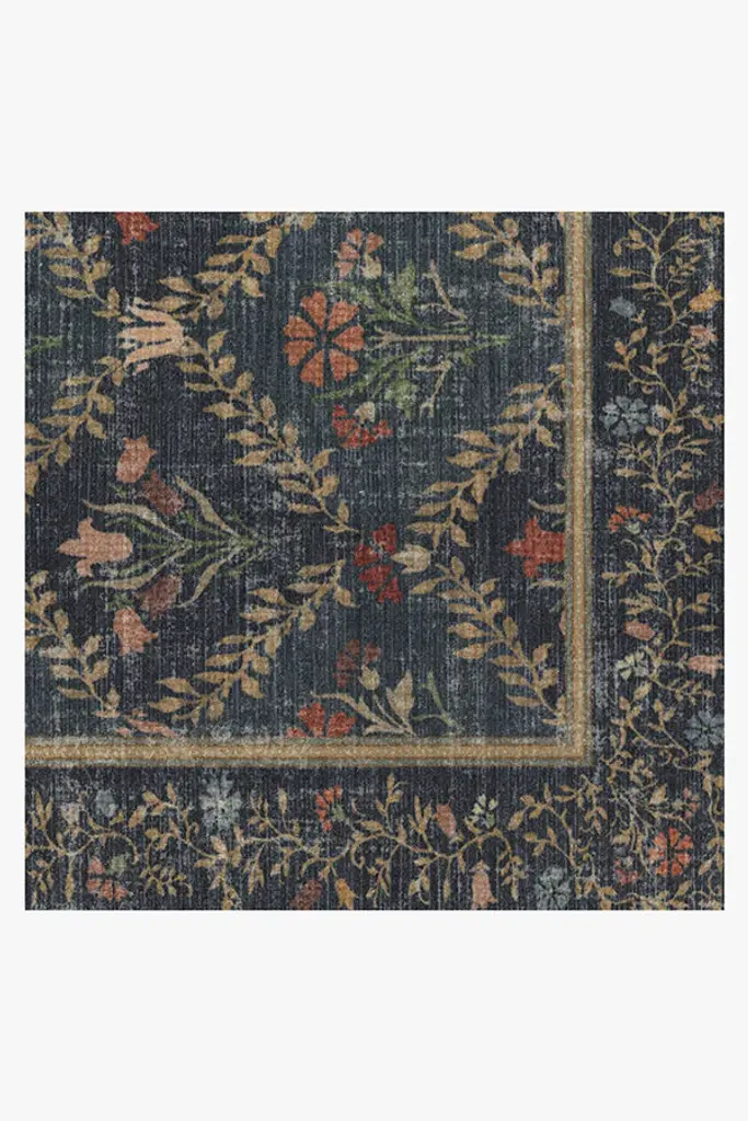 Gaze at the organic beauty of the Morris & Co. Bellflowers Blue Rug. Our interpretation of William Morris's famed carpet design from the late 1800s, this rug boasts a beautiful lattice vine design and delicate bouquets that evoke the promise of spring. A harmonious border of floral buds and leaves frames the design in intricate detail. Navy blue grounds the design, while highlights of mauve, light pink, sage green, and sky blue make it sing. Water-resistant, stain-resistant, and machine-washable. Rug colors may vary slightly according to your device and the lighting in your space.
