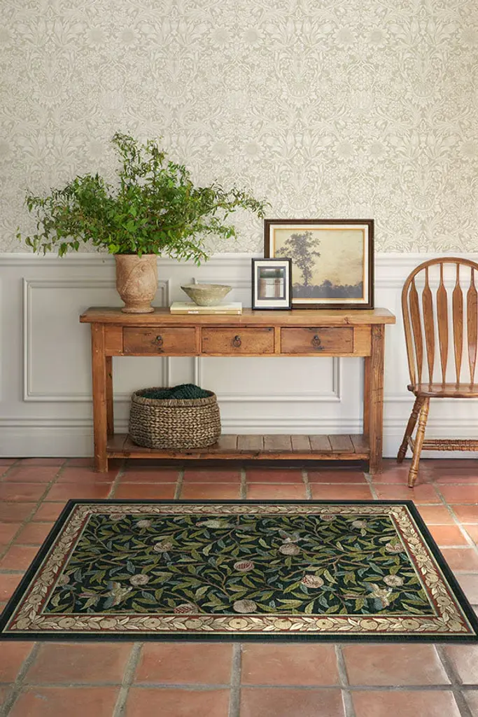 Let your room sing with our Morris & Co. Bird & Pomegranate Teal Green Rug. We've transformed the 1926 wallpaper design into a charming vignette with a modern, playful border. Originally inspired by views from William Morris's personal home, this whimsical scene features birds swooping, perching, and pecking amidst a maze of pomegranate plants. The composition features rich tones of fern green, blue-green, deep red and warm beiges for a welcoming balance of color. Water-resistant, stain-resistant, and machine-washable. Rug colors may vary slightly according to your device and the lighting in your space.