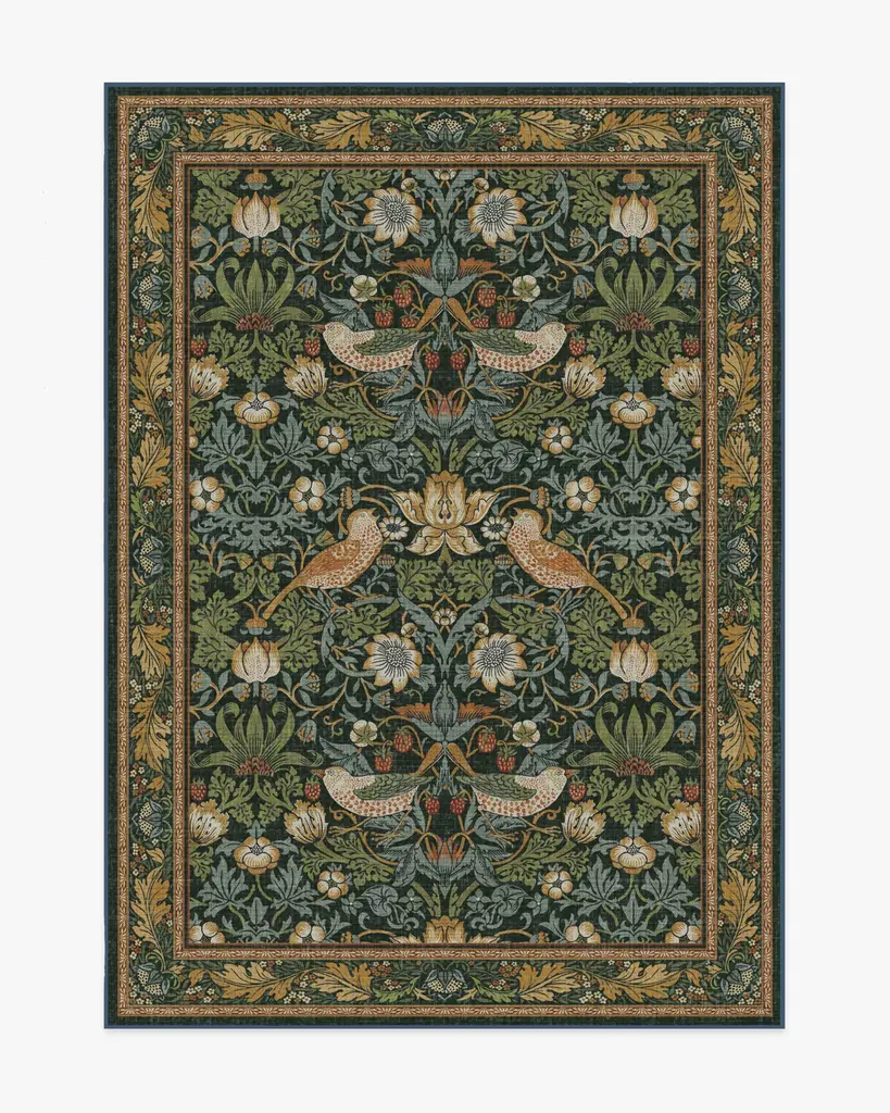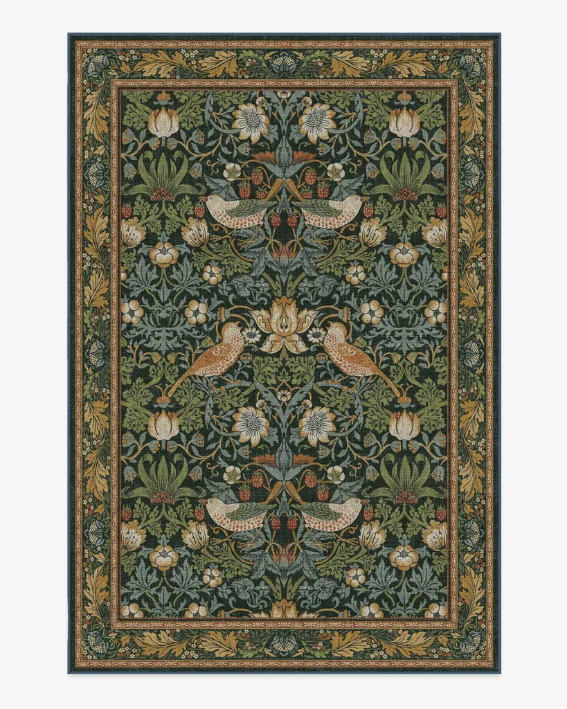 Let your room sing with our Morris & Co. Bird & Pomegranate Teal Green Rug. We've transformed the 1926 wallpaper design into a charming vignette with a modern, playful border. Originally inspired by views from William Morris's personal home, this whimsical scene features birds swooping, perching, and pecking amidst a maze of pomegranate plants. The composition features rich tones of fern green, blue-green, deep red and warm beiges for a welcoming balance of color. Water-resistant, stain-resistant, and machine-washable. Rug colors may vary slightly according to your device and the lighting in your space.