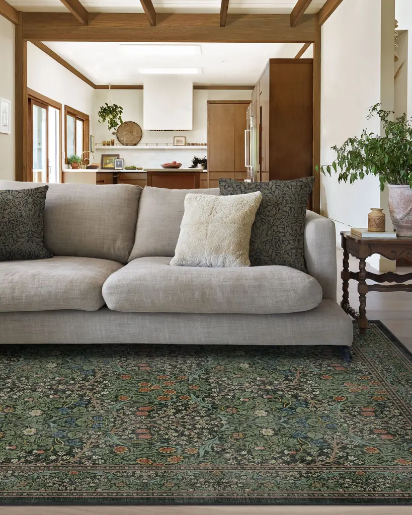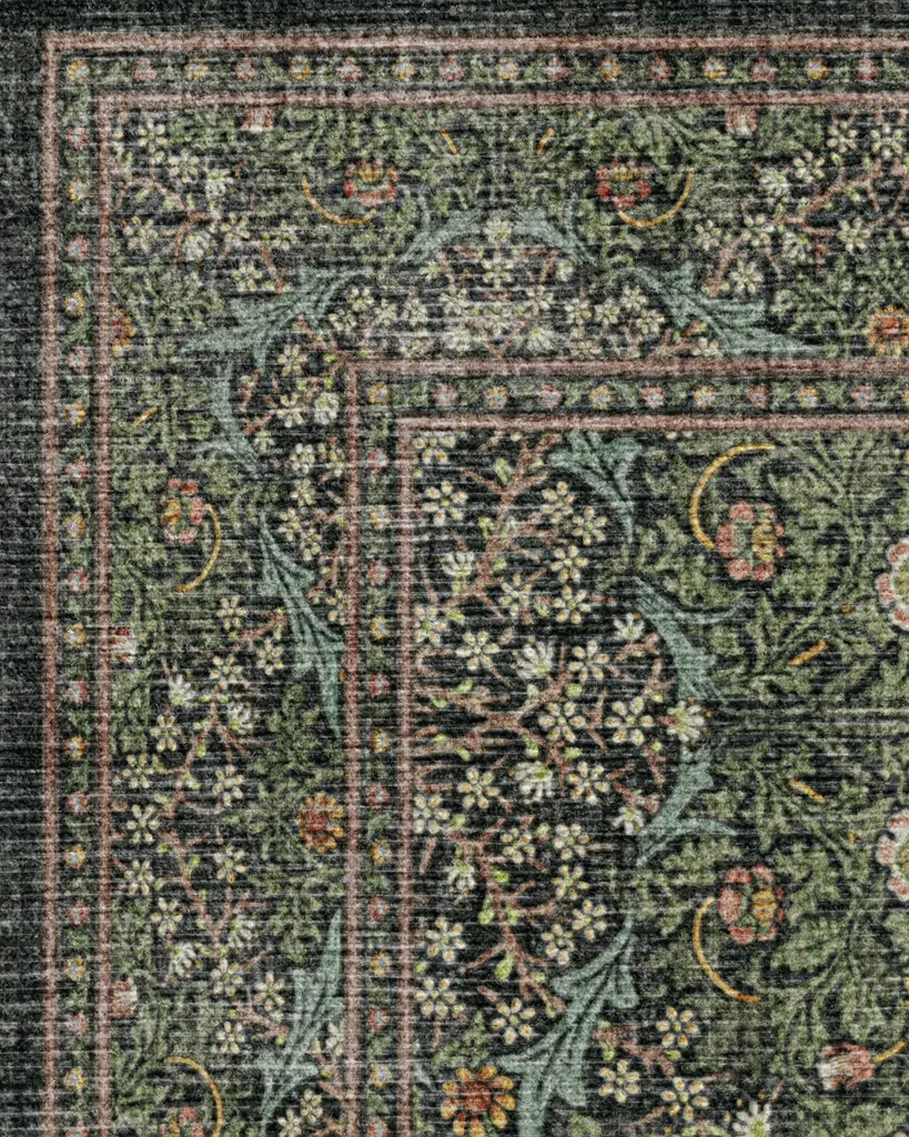 Fall in love with our whimsical Morris & Co. Blackthorn Forest Green Rug. Originally designed for wallpaper by John Henry Dearle in 1892, this intricate weave of blossoms, blooms, and vines layers rich greens and playful reds for luxurious depth. We have reimagined the classic pattern to include a border that anchors the design with a touch of formality and visual order. Water-resistant, stain-resistant, and machine-washable. Rug colors may vary slightly according to your device and the lighting in your space.
