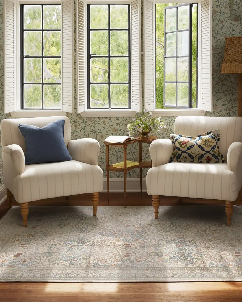Fall in love with our whimsical Morris & Co. Blackthorn Ivory Rug. Originally designed for wallpaper by John Henry Dearle in 1892, this intricate weave of blossoms, blooms, and vines layers bright greens, soft pink, warm blues, and ivory neutrals for a soft pop of color. We have reimagined the classic pattern to include a border that anchors the design with a touch of formality and visual order. Water-resistant, stain-resistant, and machine-washable. Rug colors may vary slightly according to your device and the lighting in your space.