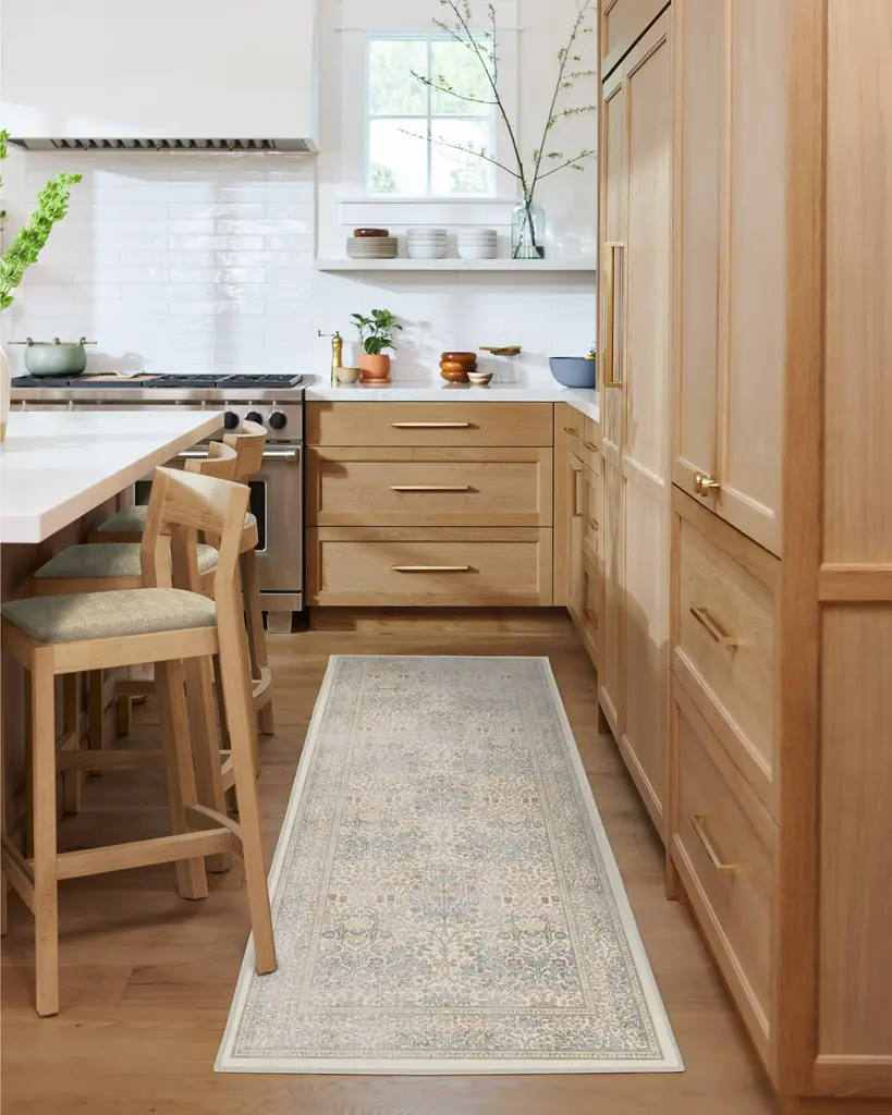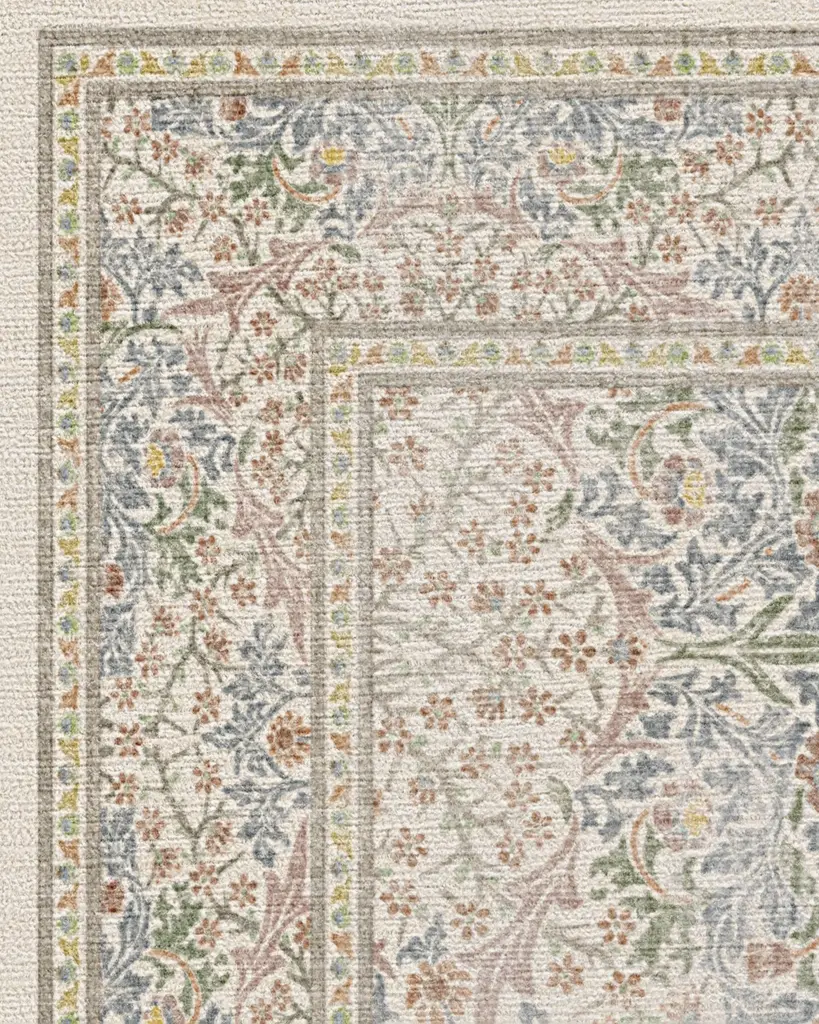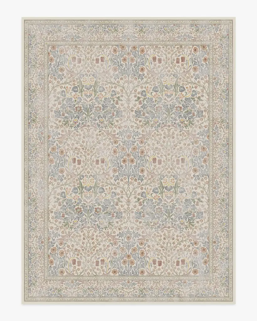 Fall in love with our whimsical Morris & Co. Blackthorn Ivory Rug. Originally designed for wallpaper by John Henry Dearle in 1892, this intricate weave of blossoms, blooms, and vines layers bright greens, soft pink, warm blues, and ivory neutrals for a soft pop of color. We have reimagined the classic pattern to include a border that anchors the design with a touch of formality and visual order. Water-resistant, stain-resistant, and machine-washable. Rug colors may vary slightly according to your device and the lighting in your space.