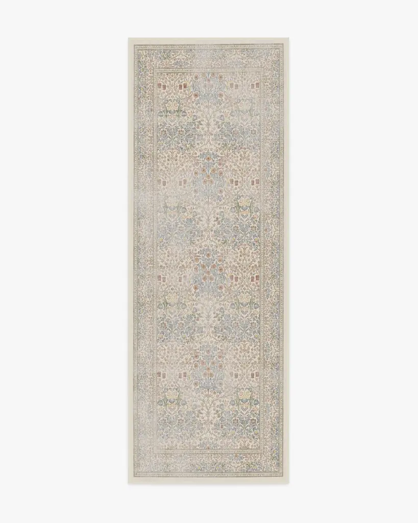 Fall in love with our whimsical Morris & Co. Blackthorn Ivory Rug. Originally designed for wallpaper by John Henry Dearle in 1892, this intricate weave of blossoms, blooms, and vines layers bright greens, soft pink, warm blues, and ivory neutrals for a soft pop of color. We have reimagined the classic pattern to include a border that anchors the design with a touch of formality and visual order. Water-resistant, stain-resistant, and machine-washable. Rug colors may vary slightly according to your device and the lighting in your space.