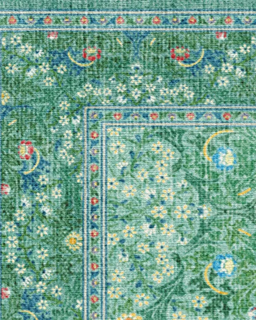 Fall in love with our whimsical Morris & Co. Blackthorn Multicolor Jade Rug. Originally designed for wallpaper by John Henry Dearle in 1892, this intricate weave of blossoms, blooms, and vines layers pops of bold pinks, sunshine yellows, playful greens, and vibrant blues for a cheerful composition. We have reimagined the classic pattern to include a border that anchors the design with a touch of formality and visual order. Water-resistant, stain-resistant, and machine-washable. Rug colors may vary slightly according to your device and the lighting in your space.