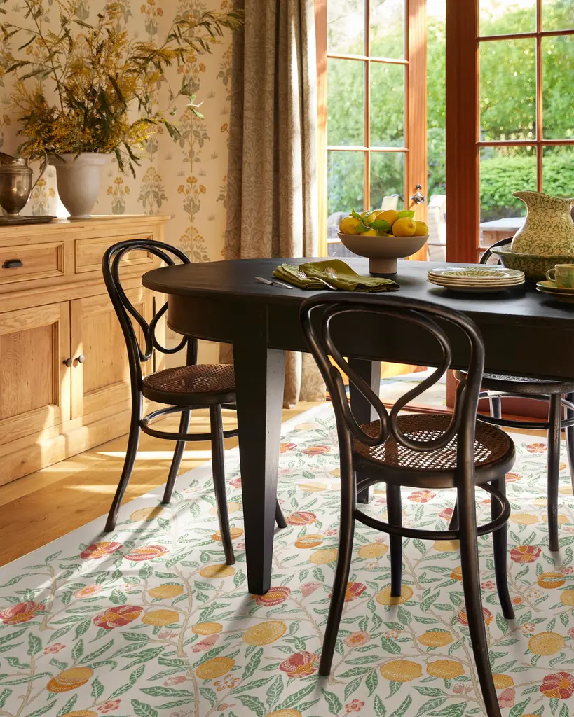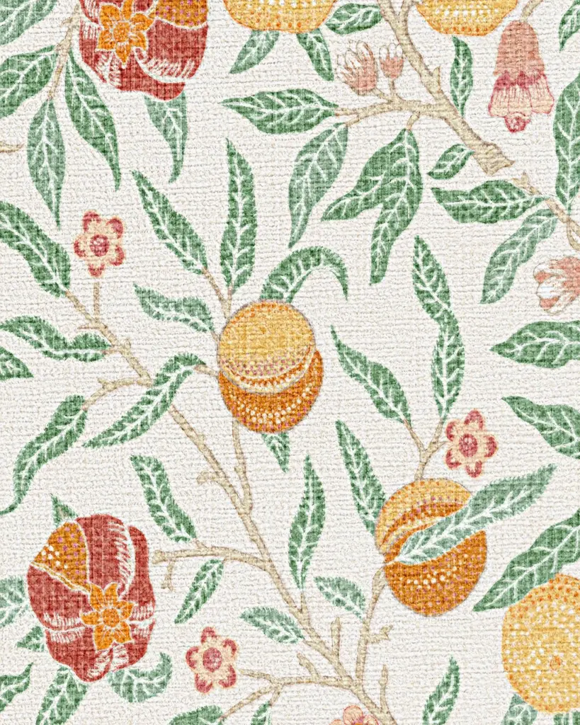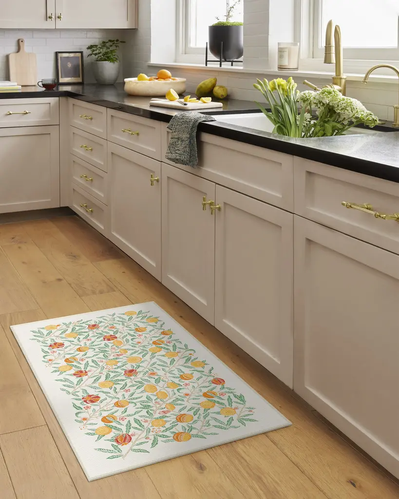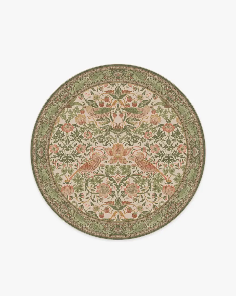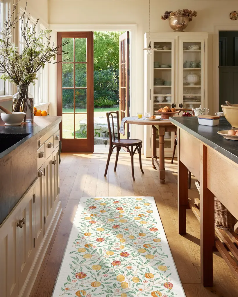 Fall in love with our delightful Morris & Co. Fruit Ivory & Multicolor Rug. A modern translation of one of William Morris's earliest designs, this classic depiction of fruit and florals brings outdoor beauty indoors. The cottagecore palette mixes earthy greens, juicy reds, and sunshine yellows on a neutral cream background for cozy charm. Water-resistant, stain-resistant, and machine-washable. Rug colors may vary slightly according to your device and the lighting in your space.