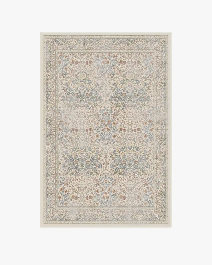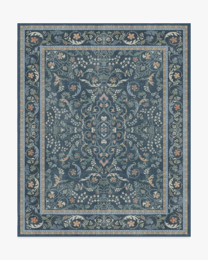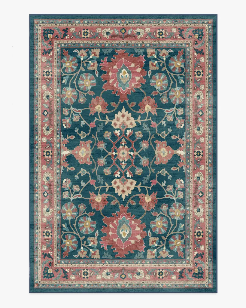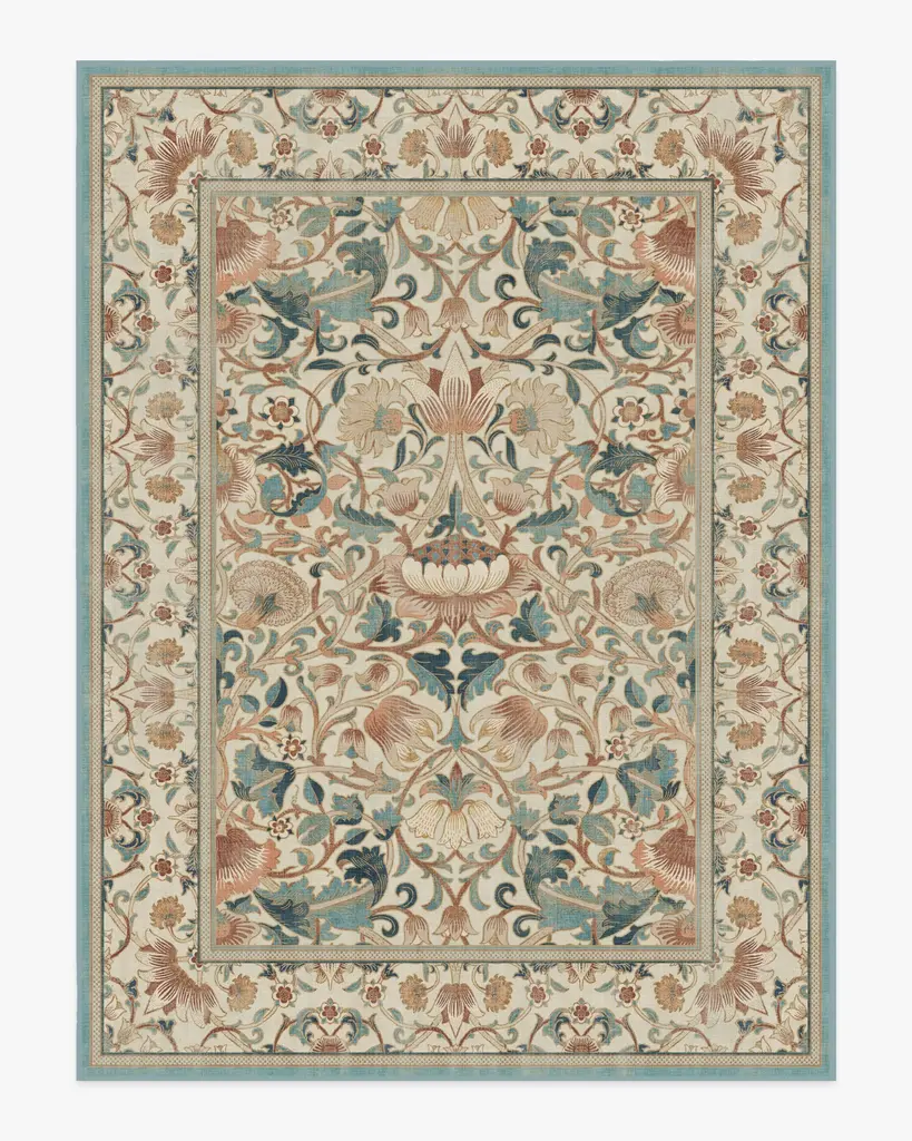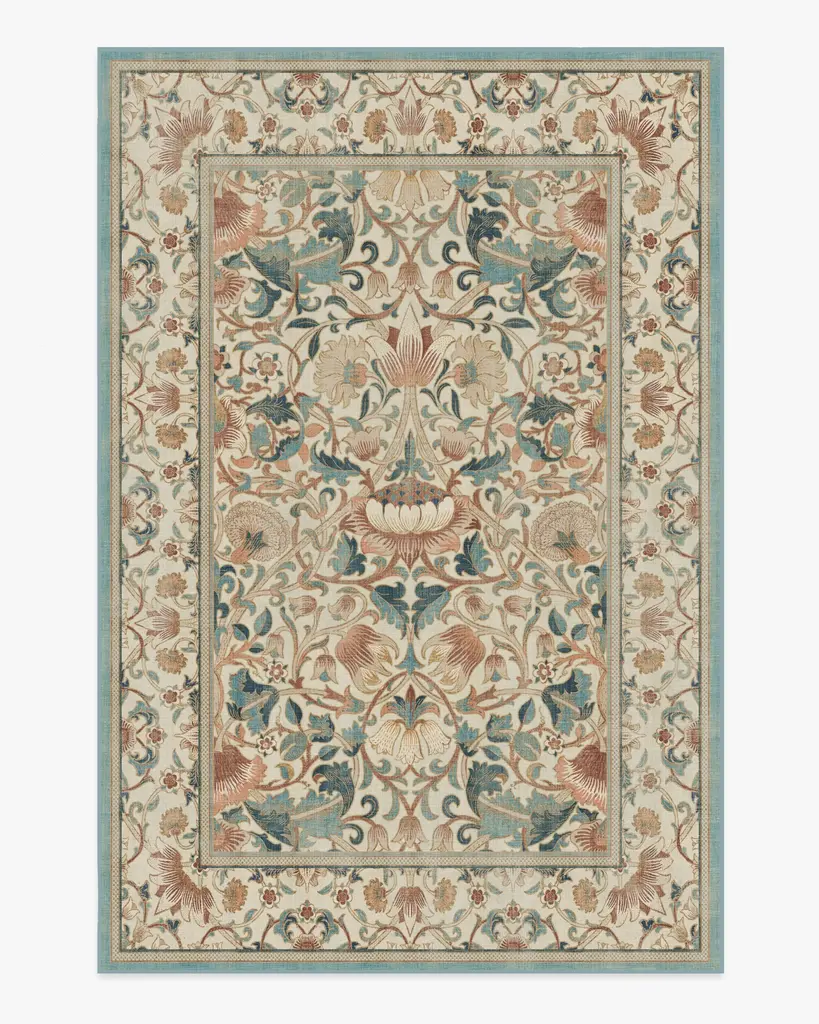 Enjoy life in full bloom with our Morris & Co. Lodden Soft Rose & Teal Rug. This fresh depiction of a classic William Morris design adds decadence to any room with its rich textures and golden hues. The intertwining florals expand from a central bloom, anchoring the composition in natural beauty. Teal blue and soft pink blooms layer on top of a classic cream background for an antique color palette. Water-resistant, stain-resistant, and machine-washable. Rug colors may vary slightly according to your device and the lighting in your space.