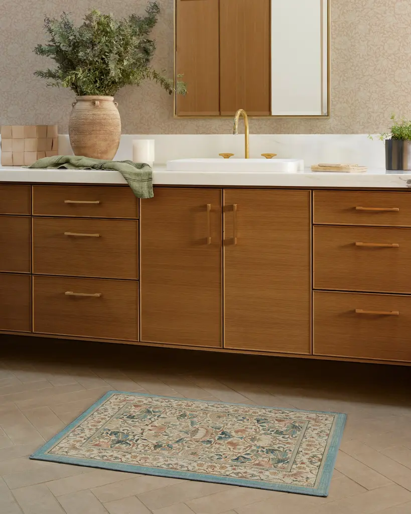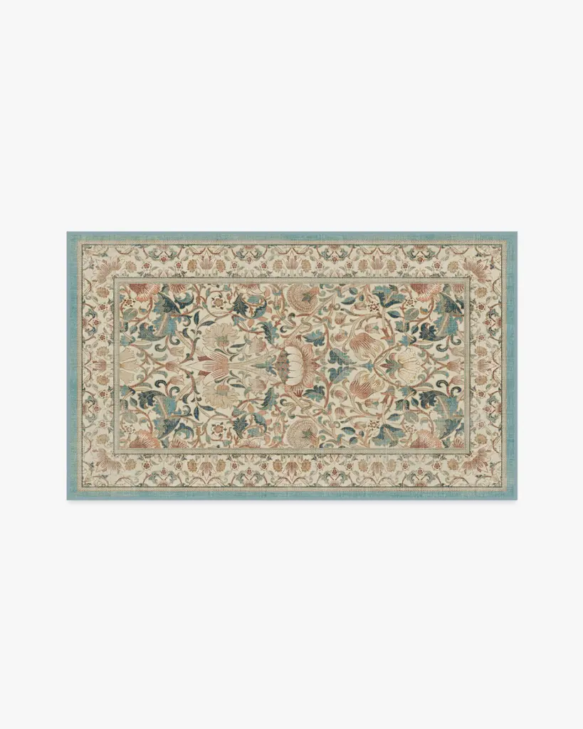 Enjoy life in full bloom with our Morris & Co. Lodden Soft Rose & Teal Rug. This fresh depiction of a classic William Morris design adds decadence to any room with its rich textures and golden hues. The intertwining florals expand from a central bloom, anchoring the composition in natural beauty. Teal blue and soft pink blooms layer on top of a classic cream background for an antique color palette. Water-resistant, stain-resistant, and machine-washable. Rug colors may vary slightly according to your device and the lighting in your space.