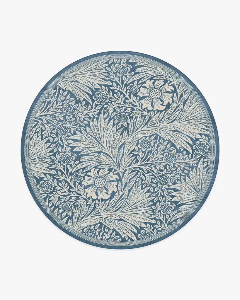 Meet a modern take on a heritage classic, our Morris & Co. Marigold Blue Rug. Featuring William Morris's famed line work, this playful shift of scale depicts the ebb and flow of natural growth. The fresh color palette pairs shades of blue with soft creams for a balance of warm and cool tones. Water-resistant, stain-resistant, and machine-washable. Rug colors may vary slightly according to your device and the lighting in your space.