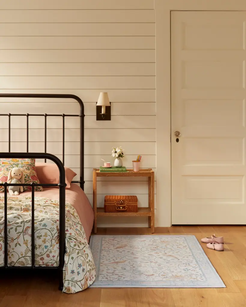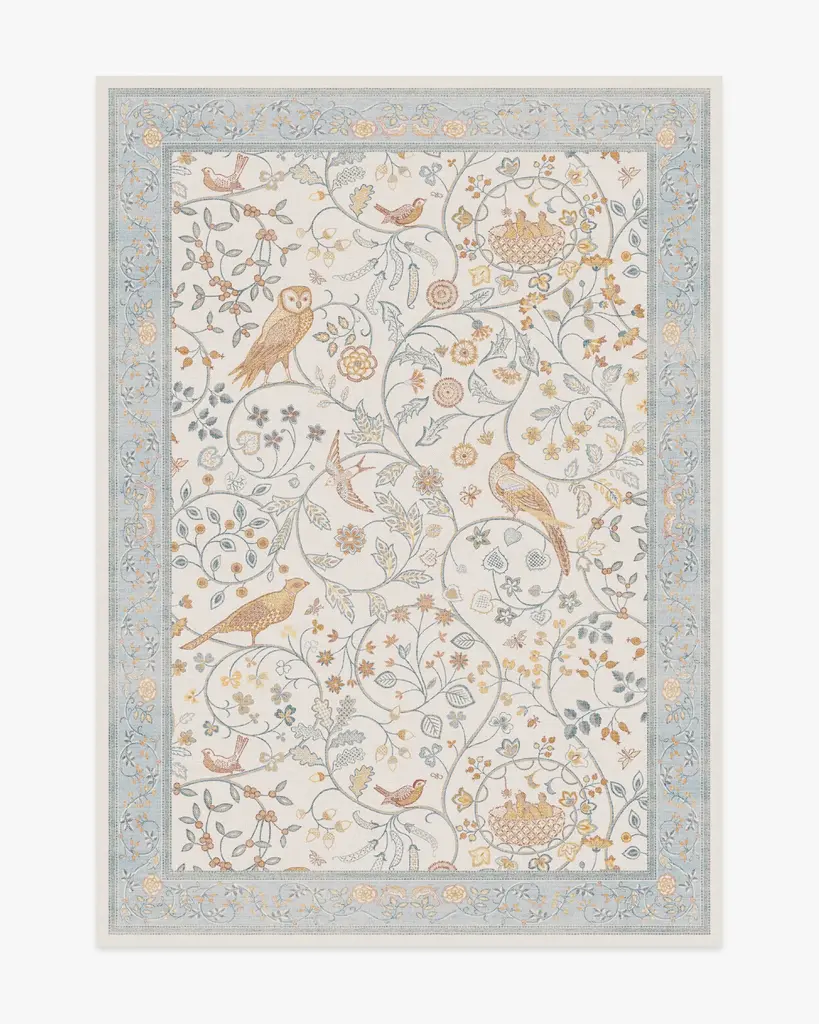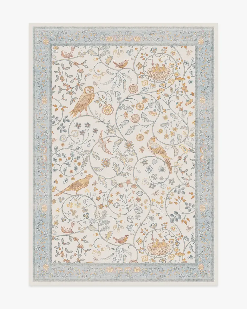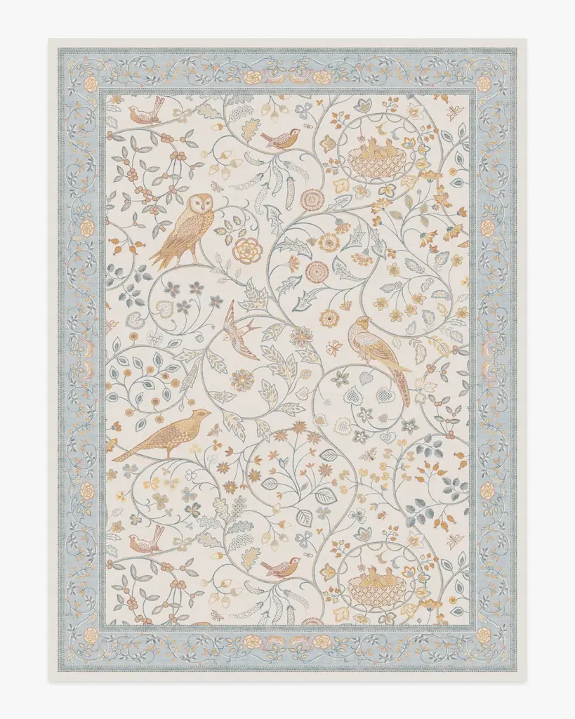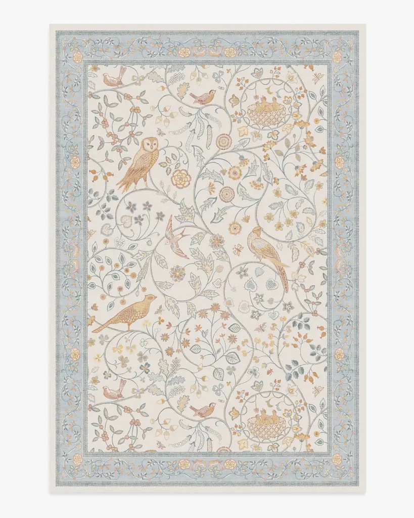 Play all day with our Morris & Co. Newill Ivory & Blue Rug. Inspired by the youthful embroidery work of Mary Newill, an associate of May Morris at the Birmingham School of Art, from 1905, this cozy composition brings heritage design to modern life. The cheerful, swirling display of birds, blooming florals, and meandering fauna is framed by a soft, detailed border. The powdery blue, bright ivory and warm gold in the composition add warmth to any room. Water-resistant, stain-resistant, and machine-washable. Rug colors may vary slightly according to your device and the lighting in your space.