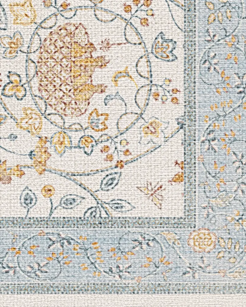 Play all day with our Morris & Co. Newill Ivory & Blue Rug. Inspired by the youthful embroidery work of Mary Newill, an associate of May Morris at the Birmingham School of Art, from 1905, this cozy composition brings heritage design to modern life. The cheerful, swirling display of birds, blooming florals, and meandering fauna is framed by a soft, detailed border. The powdery blue, bright ivory and warm gold in the composition add warmth to any room. Water-resistant, stain-resistant, and machine-washable. Rug colors may vary slightly according to your device and the lighting in your space.