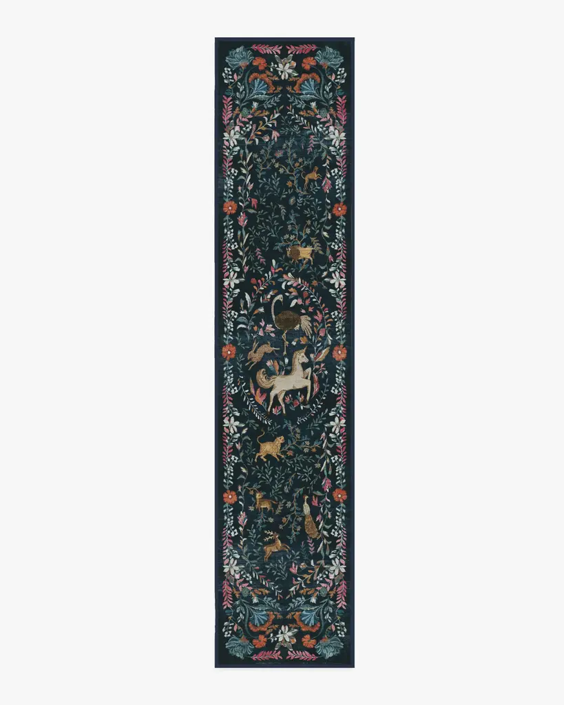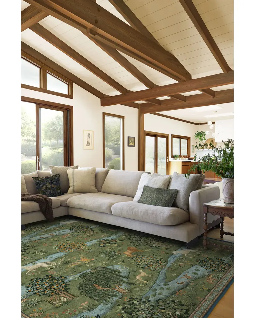 Be transported by the enchanting Morris & Co. Owl & Willow Green Rug. This whimsical, tapestry-like landscape features charming animals and a meandering river amidst a stylized forest. Pops of yellow, blue, orange, coral and red bring this lush green landscape to life. Water-resistant, stain-resistant, and machine-washable. Rug colors may vary slightly according to your device and the lighting in your space.