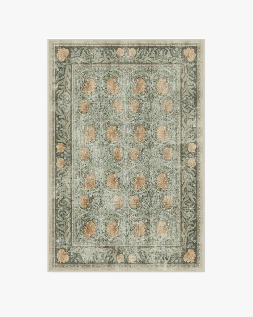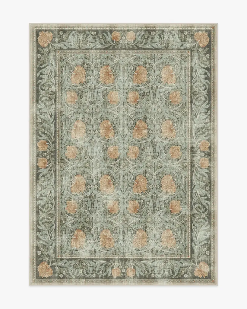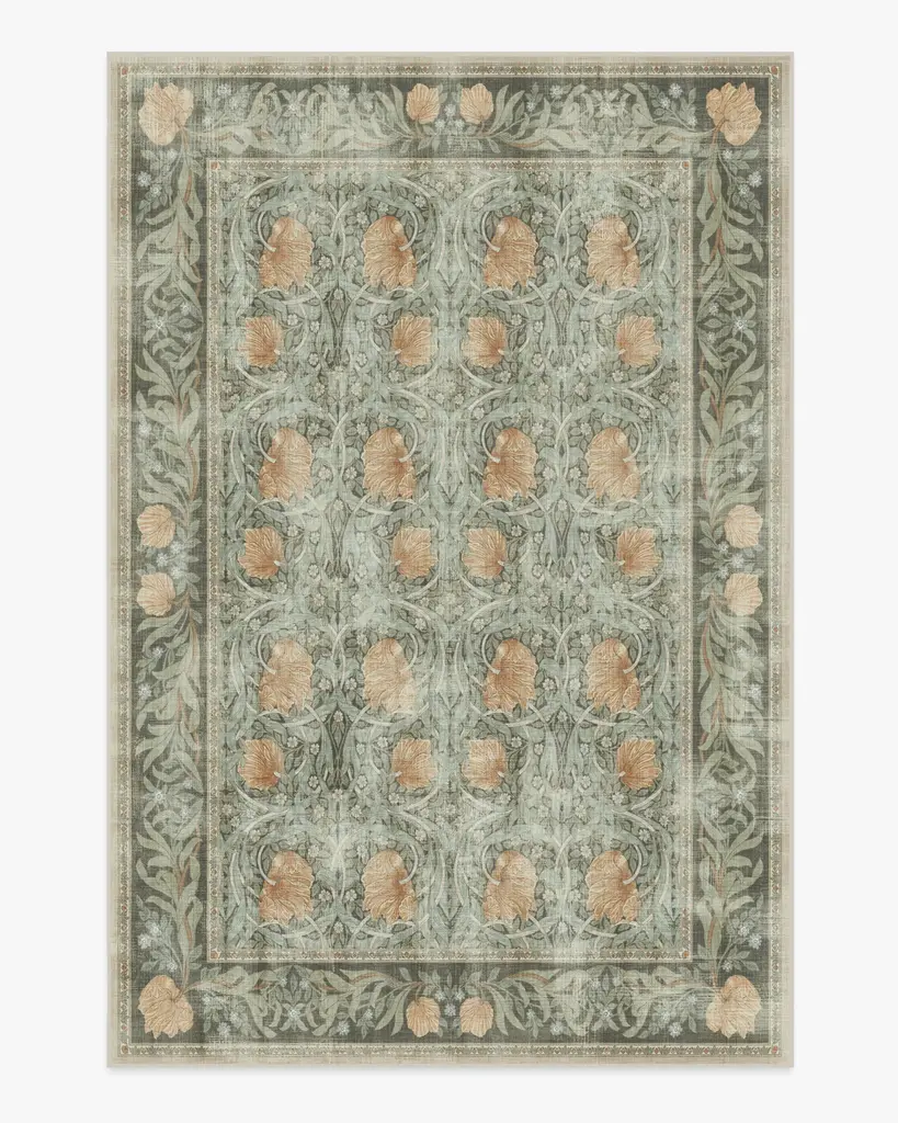 Our Morris & Co. Pimpernel Jade Rug brings the rhythmic florals of William Morris' famed wallpaper to the floor with refined elegance. The interlocking vines and tulips that once scaled Morris's own dining room in his Kelmscott House are now framed with an ornate border that helps define any space. Warm blooms sing atop textured cool grey and blue-greens for a natural color scheme inspired by the English countryside. Water-resistant, stain-resistant, and machine-washable. Rug colors may vary slightly according to your device and the lighting in your space.