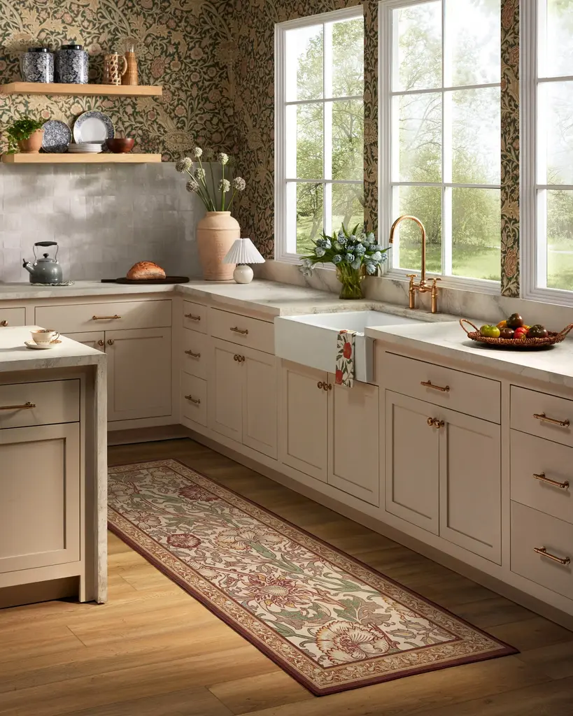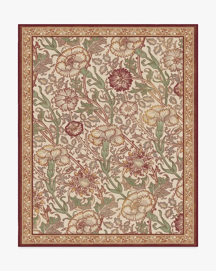 Meet our Morris & Co. Pink & Rose Burgundy Rug, made for memorable moments. Designed by William Morris himself, this detailed composition of delicate linework, interlocking roses, and flowering carnations adds character and charm to any room. A modern translation of vintage woodblock printing techniques, this design features an antiqued color palette of rich burgundy, natural gold, earthy green, and soft grey. Water-resistant, stain-resistant, and machine-washable. Rug colors may vary slightly according to your device and the lighting in your space.