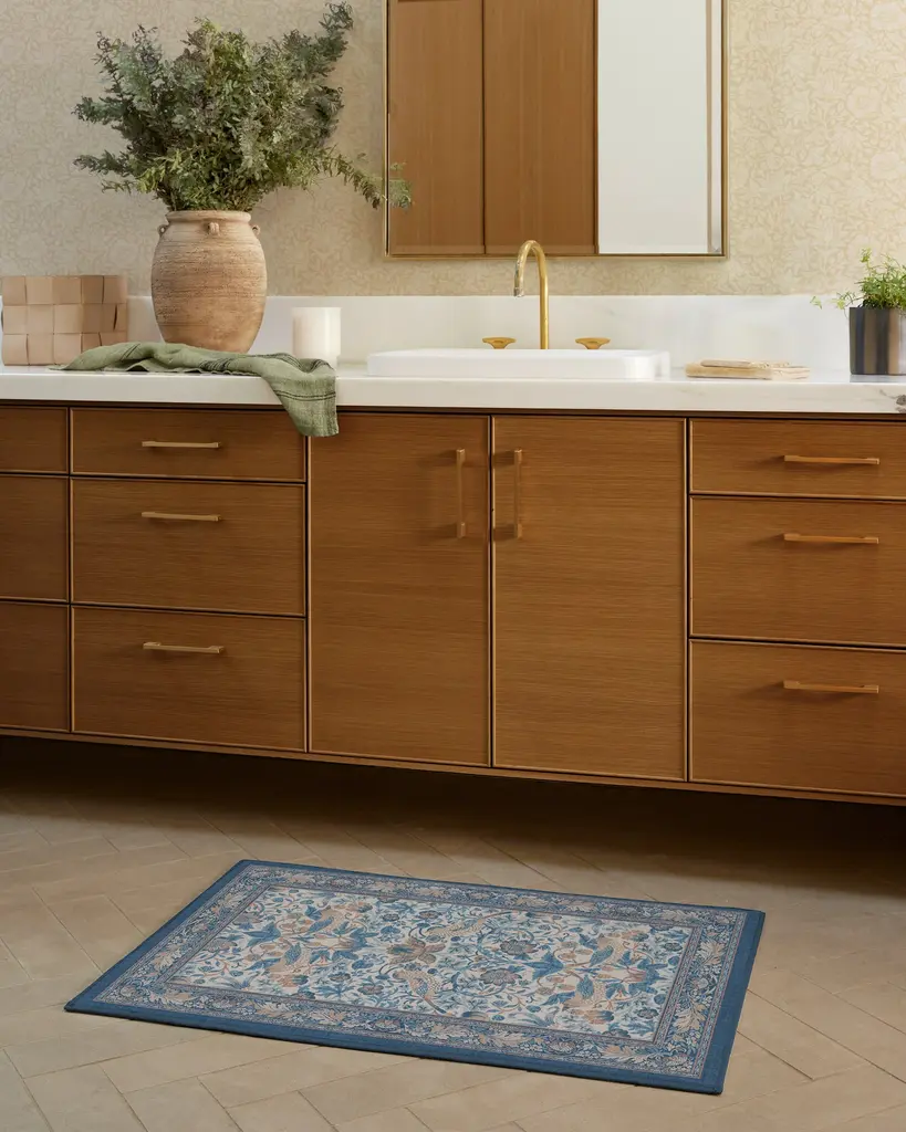 Step into Kelmscott Manor's garden with the Morris & Co. Strawberry Thief Indigo & Ivory Rug. A direct translation of William Morris's recognizable block print textile, this rug depicts Morris's thrushes stealing fruit from his kitchen garden. A classic blue and white recolor of the original design, this colorway balances warm and cool tones with indigo, delft, and dusty blues complementing taupe, ivory, and beige accents, for traditional grandeur. Water-resistant, stain-resistant, and machine-washable. Rug colors may vary slightly according to your device and the lighting in your space.