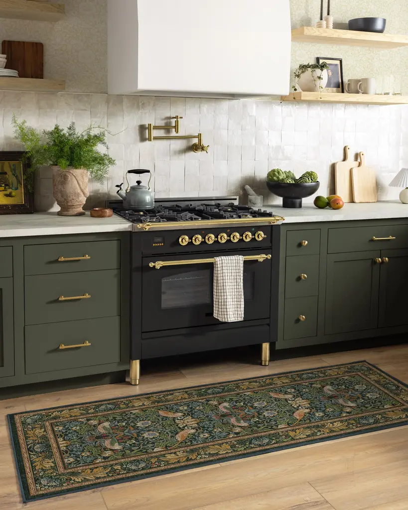 Step into Kelmscott Manor's garden with the Morris & Co. Strawberry Thief Indigo Rug. A direct translation of William Morris's recognizable block print textile, this rug depicts Morris's thrushes stealing fruit from his kitchen garden. A nod to the original design, this colorway contrasts deep indigo with fresh reds, mossy greens, and golden highlights, leaving a grand impact. Water-resistant, stain-resistant, and machine-washable. Rug colors may vary slightly according to your device and the lighting in your space.