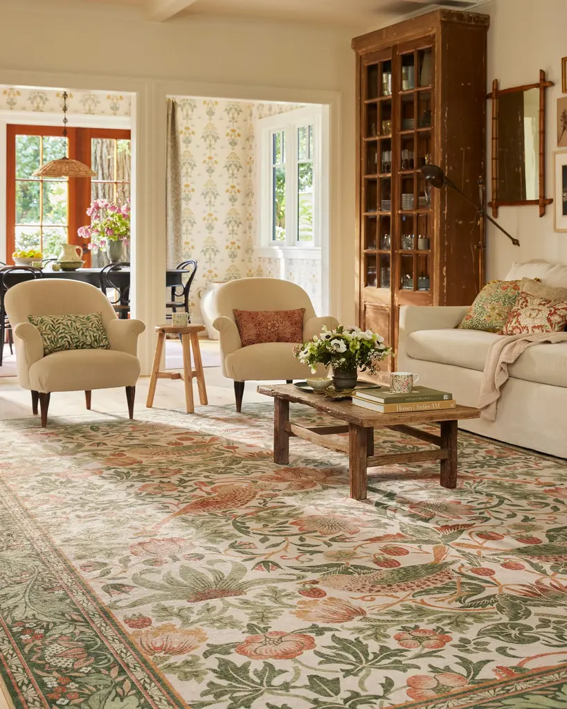 Step into Kelmscott Manor's garden with the Morris & Co. Strawberry Thief Sage & Rose Rug. A direct translation of William Morris's recognizable block print textile, this rug depicts Morris's thrushes stealing fruit from his kitchen garden. An earthy recolor of the original design, this colorway contrasts natural greens, floral pinks, and soft corals, leaving a grand impact. Water-resistant, stain-resistant, and machine-washable. Rug colors may vary slightly according to your device and the lighting in your space.