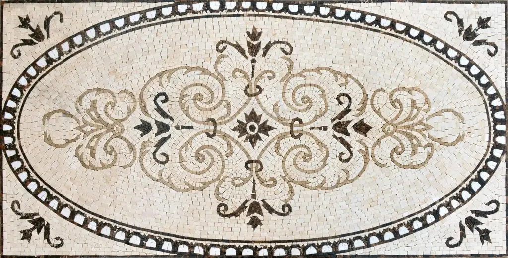 Transform your living space with the stunning Mosaic Rug - Lynn, a masterpiece crafted specifically for those who appreciate art in their home décor. This exquisite mosaic rug features a captivating rectangular shape, elegantly designed with neutral colors that seamlessly blend into any setting. At the heart of the rug lies a striking black oval, adding a bold yet sophisticated touch that enhances the overall aesthetic.Each Mosaic Rug - Lynn is a fully handmade creation, meticulously crafted from high-quality marble stones. This artisanal approach not only ensures uniqueness in every piece but also showcases the exceptional skill and dedication of the craftsmen behind it. The vibrant patterns and textures of the marble stones create a visual tapestry that is sure to be a conversation starter in any room.Suitable for both interior and exterior settings, the Mosaic Rug - Lynn is versatile enough to elevate your living room, entryway, patio, or garden space. Its durability and weather-resistant properties make it an ideal choice for outdoor use, allowing you to create an inviting atmosphere anywhere you choose.Whether you're looking to enhance your home’s aesthetic appeal or seeking a unique gift for a friend, the Mosaic Rug - Lynn is perfect for adding a touch of elegance and charm. Experience the beauty of handcrafted artistry and transform your surroundings with this exceptional mosaic rug. Your space deserves the sophistication and allure that the Mosaic Rug - Lynn brings.