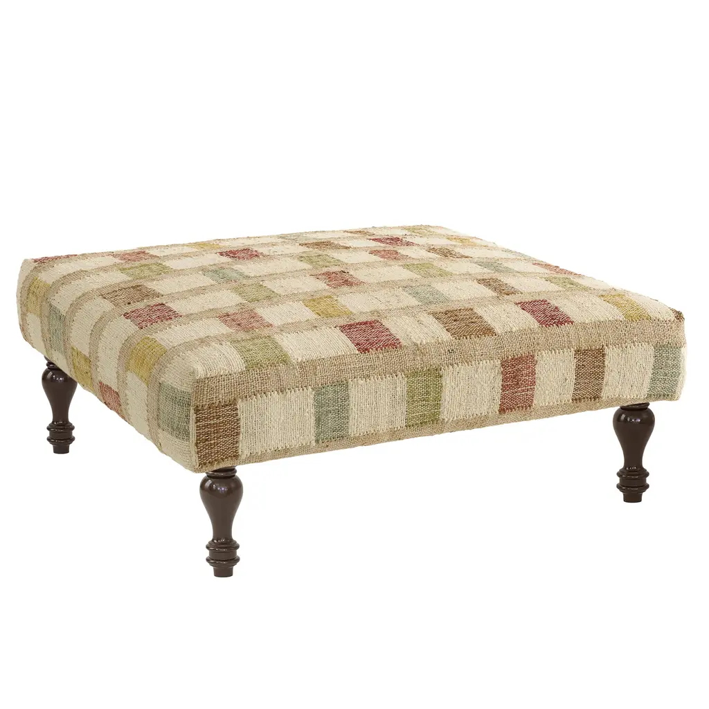 Our finely textured, low-profile jute rug - Mosaic Handwoven Jute Rug - now beautifully reimagined and upholstered as a stunning contemporary ottoman. Expertly handwoven in a modern, multi-check grid of natural, seaglass, denim, navy, and juniper blocks on ivory. Woven in hardworking jute with a touch of cotton for softness, this cushioned ottoman is held aloft by a choice of shapely turned-wood legs in a variety of finishes. An ideal placement for front of sofa or end of bed, doing double duty as occasional seating and staging area for a tray. This supersmart addition to entryway, living room or bedroom is a versatile investment piece, available in two sizes.