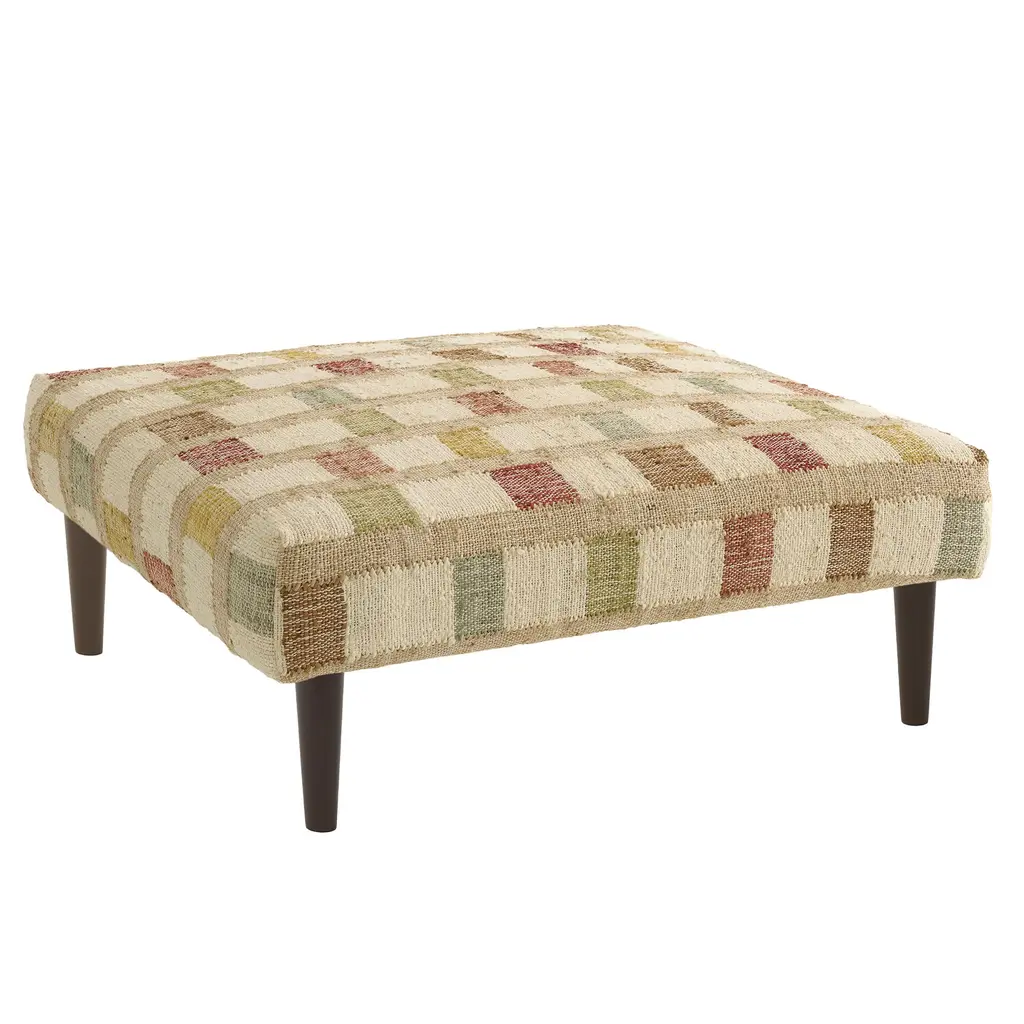 Our finely textured, low-profile jute rug - Mosaic Handwoven Jute Rug - now beautifully reimagined and upholstered as a stunning contemporary ottoman. Expertly handwoven in a modern, multi-check grid of natural, seaglass, denim, navy, and juniper blocks on ivory. Woven in hardworking jute with a touch of cotton for softness, this cushioned ottoman is held aloft by a choice of shapely turned-wood legs in a variety of finishes. An ideal placement for front of sofa or end of bed, doing double duty as occasional seating and staging area for a tray. This supersmart addition to entryway, living room or bedroom is a versatile investment piece, available in two sizes.